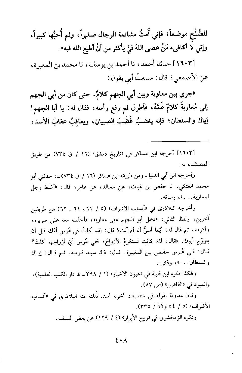 1603 - حَدَّثَنَا أَحْمَدُ، نَا أَحْمَدُ بْنُ يُوسُفَ، نَا مُحَمَّدُ بْنُ الْمُغِيرَةِ، عَنِ الأَصْمَعِيِّ؛ قَالَ: سَمِعْتُ أَبِي يَقُولُ: جَرَى بَيْنَ مُعَاوِيَةَ وَبَيْنَ أَبِي الْجَهْمِ كَلامٌ، حَتَّى كَانَ مِنْ أَبِي الْجَهْمِ إِلَى مُعَاوِيَةَ كَلامٌ غَمَّهُ، فَأَطْرَقَ ثُمَّ رَفَعَ رَأْسَهُ، فَقَالَ لَهُ: يَا أَبَا الْجَهْمِ! إِيَّاكَ وَالسُّلْطَانَ؛ فَإِنَّهُ يَغْضَبُ غَضَبَ الصِّبْيَانِ، وَيُعَاقِبُ عِقَابَ الأَسَدِ، -[409]- وَإِنَّ قَلِيلَهُ يَغْلِبُ كَثِيرَ النَّاسِ. ثُمَّ أَمَرَ لَهُ بِمَالٍ، فَأَنْشَأَ أَبُو الْجَهْمِ يَقُولُ: