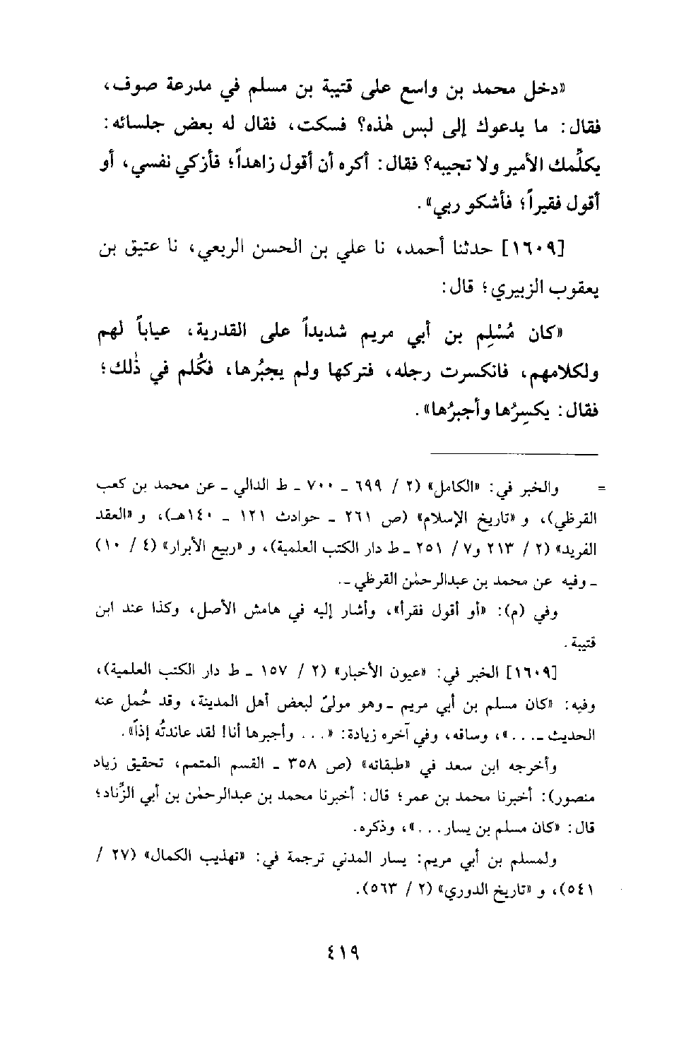 1609 - حَدَّثَنَا أَحْمَدُ، نَا عَلِيُّ بْنُ الْحَسَنِ الرَّبَعِيُّ، نَا عَتِيقُ بْنُ يَعْقُوبَ الزُّبَيْرِيُّ؛ قَالَ: كَانَ مُسْلِمُ بْنُ أَبِي مَرْيَمَ شَدِيدًا عَلَى الْقَدَرِيَّةِ، عَيَّابًا لَهُمْ وَلِكَلامِهِمْ، فَانْكَسَرَتْ رِجْلُهُ، فَتَرَكَهَا وَلَمْ يَجْبُرْهَا، فَكُلِّمَ فِي ذَلِكَ؛ فَقَالَ: يَكْسِرُهَا وَأُجَبْرُهَا! !