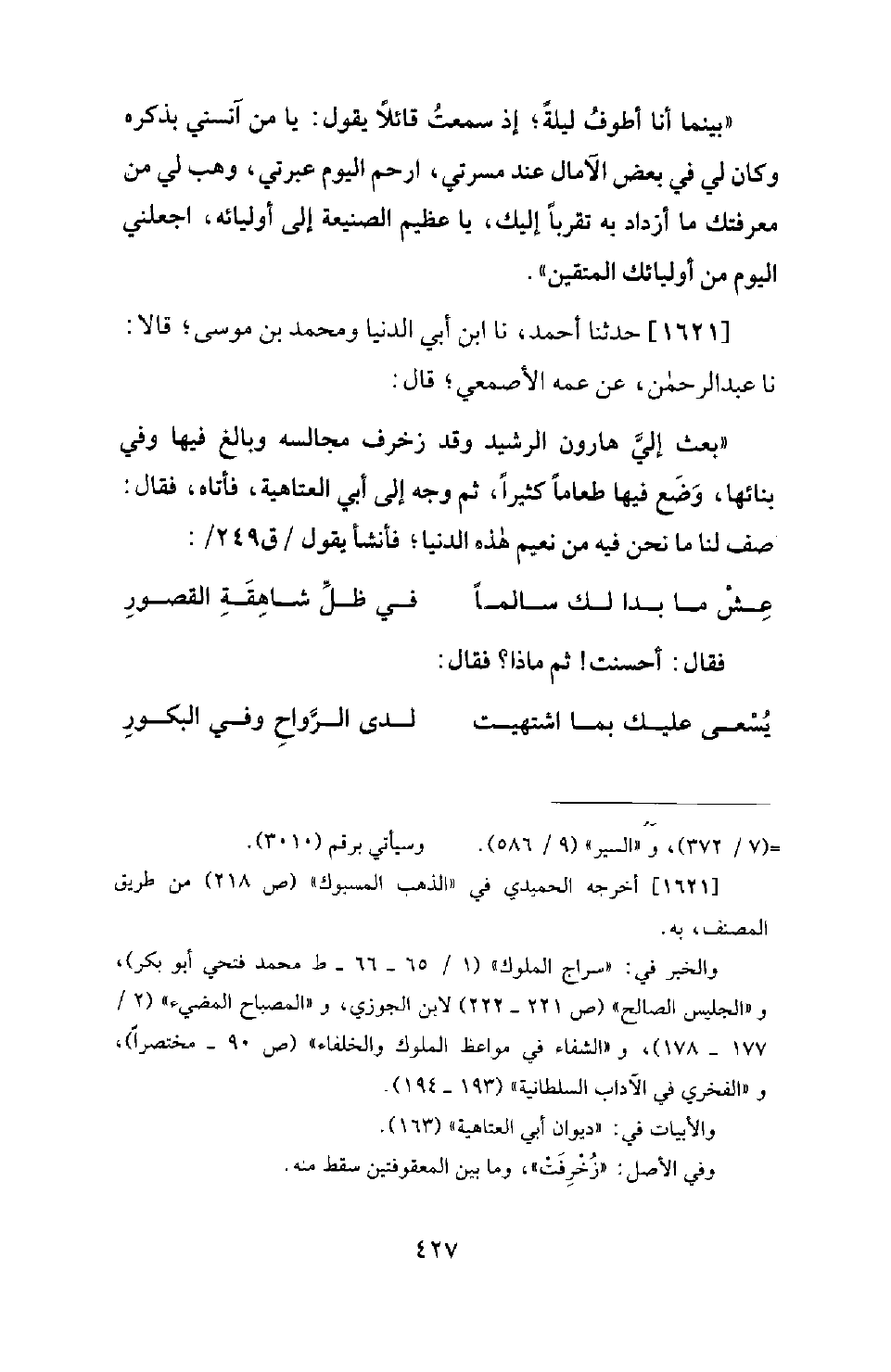 1621 - حَدَّثَنَا أَحْمَدُ، نَا ابْنُ أَبِي الدُّنْيَا وَمُحَمَّدُ بْنُ مُوسَى؛ قَالا: نَا عَبْدُ الرَّحْمَنِ، عَنْ عَمِّهِ الأَصْمَعِيِّ؛ قَالَ: بَعَثَ إِلَيَّ هَارُونُ الرَّشِيدُ وَقَدْ زَخْرَفَ مَجَالِسَهُ وَبَالَغَ فيها وفي بنائها، [و] وَضَعَ فِيهَا طَعَامًا كَثِيرًا، ثُمَّ وَجَّهَ إِلَى أَبِي الْعَتَاهِيَةِ، فَأَتَاهُ، فَقَالَ: صِفْ لَنَا مَا نَحْنُ فِيهِ مِنْ نَعِيمِ هَذِهِ الدُّنْيَا؛ فَأَنْشَأَ يَقُولُ: