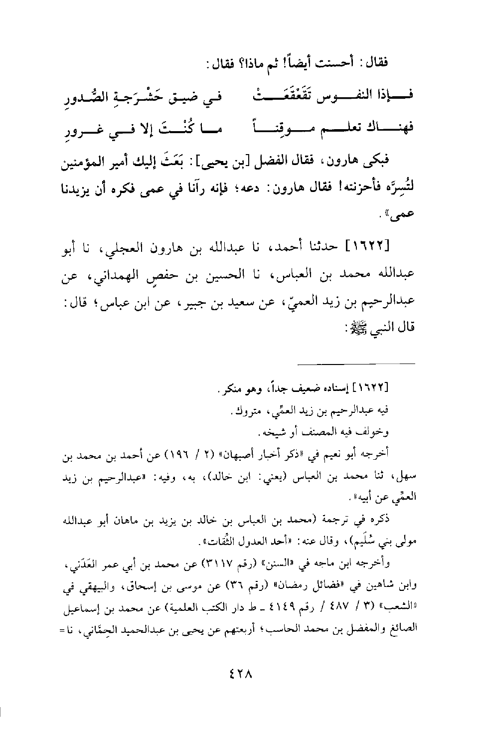1622 - حَدَّثَنَا أَحْمَدُ، نَا عَبْدُ اللهِ بْنُ هَارُونَ الْعِجْلِيُّ، نَا أَبُو عَبْدِ اللهِ مُحَمَّدُ بْنُ الْعَبَّاسِ، نَا الْحُسَيْنُ بْنُ حَفْصٍ الْهَمَدَانِيُّ، عَنْ عَبْدِ الرَّحِيمِ بْنِ زَيْدٍ الْعَمِّيِّ، عَنْ سَعِيدِ بْنِ جُبَيْرٍ، عَنِ ابْنِ عَبَّاسٍ؛ قَالَ: قَالَ النَّبِيُّ صَلَّى اللَّهُ عَلَيْهِ وَسَلَّمَ: -[429]- «مَنْ أَدْرَكَ شَهْرَ رَمَضَانَ بِمَكَّةَ، فَصَامَهُ مِنْ أَوَّلِهِ إِلَى آخِرِهِ، وَقَامَ مَا تَيَسَّرَ لَهُ؛ كَتَبَ الله له يَعْنِي: لَهُ مِائَةَ أَلْفِ شَهْرِ رَمَضَانَ فِي غَيْرِهَا، وَكَانَ لَهُ فِي كُلِّ يَوْمٍ دَرَجَةٌ، وَفِي كُلِّ لَيْلَةٍ دَرَجَةٌ، وَفِي كُلِّ يَوْمٍ شَفَاعَةٌ، وَفِي كُلِّ لَيْلَةٍ شَفَاعَةٌ، وَفِي كُلِّ يَوْمٍ حُمْلانُ فَرَسٍ فِي سَبِيلِ اللهِ، وَفِي كُلِّ لَيْلَةٍ حُمْلانُ فَرَسٍ فِي سَبِيلِ اللهِ، وَفِي كُلِّ يَوْمٍ عِتْقُ رَقَبَةٍ، وَفِي كُلِّ لَيْلَةٍ عِتْقُ -[430]- رَقَبَةٍ»