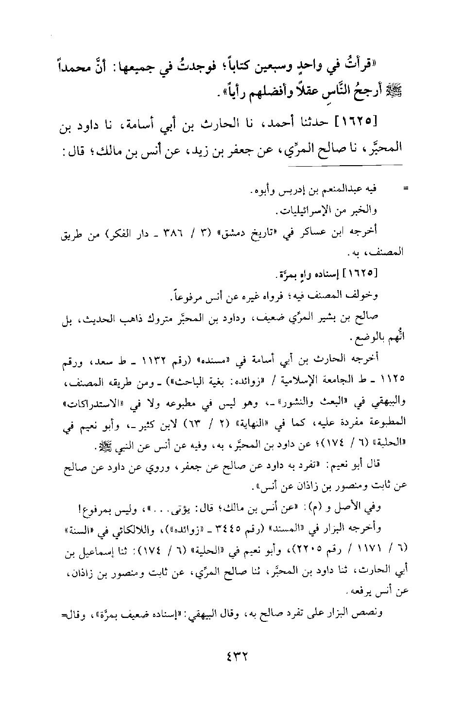 1625 - حَدَّثَنَا أَحْمَدُ، نَا الْحَارِثُ بْنُ أَبِي أُسَامَةَ، نَا دَاوُدُ بْنُ الْمُحَبَّرِ، نَا صَالِحٌ الْمُرِّيُّ، عَنْ جَعْفَرِ بْنِ زَيْدٍ، عَنْ أَنَسِ بْنِ مَالِكٍ؛ قَالَ: -[433]- يُؤْتَى بِابْنِ آدَمَ يَوْمَ الْقِيَامَةِ حَتَّى يُوقَفَ بَيْنَ كَفَّتَيِ الْمِيزَانِ، وَيُوَكَّلُ بِهِ مَلَكٌ، فَإِنْ ثَقُلَ مِيزَانُهُ نَادَى الْمَلَكُ بِصَوْتٍ يُسْمِعُ الْخَلائِقَ: سَعِدَ فُلانُ ابن فُلانٍ سَعَادَةً لا يَشْقَى بَعْدَهَا أَبَدًا، وَإِنْ خَفَّ مِيزَانُهُ نَادَى الْمَلَكُ بِصَوْتٍ يُسْمِعُ الْخَلائِقَ: شَقِيَ فُلانُ ابن فُلانٍ شَقَاءً لا يَسْعَدُ بَعْدَهُ أَبَدًا