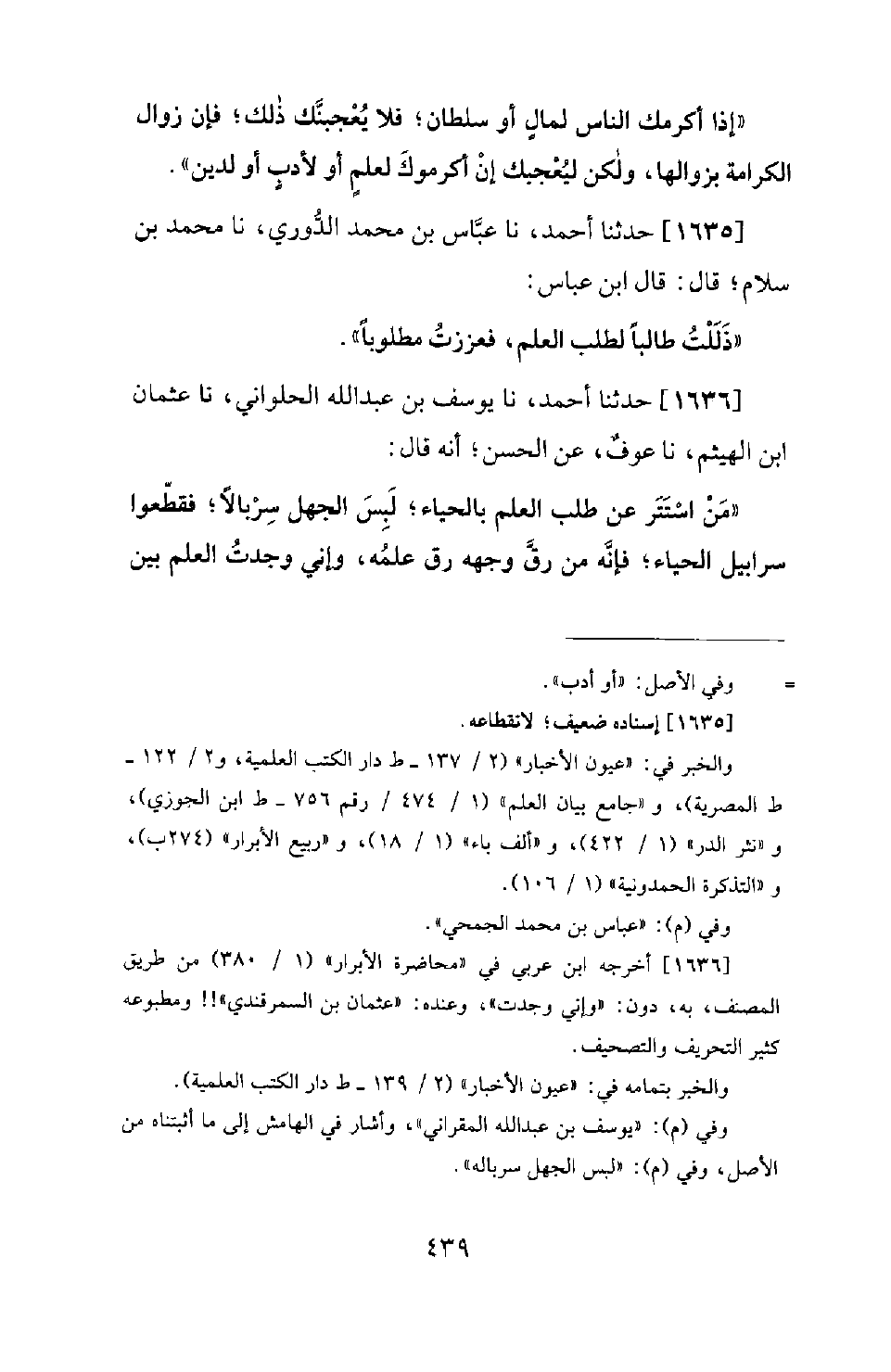 1635 - حَدَّثَنَا أَحْمَدُ، نَا عَبَّاسُ بْنُ مُحَمَّدٍ الدُّورِيُّ، نَا مُحَمَّدُ بْنُ سَلَّامٍ؛ قَالَ: قَالَ ابْنُ عَبَّاسٍ: ذَلَلْتُ طَالِبًا لِطَلَبِ الْعِلْمِ، فَعَزَزْتُ مَطْلُوبًا