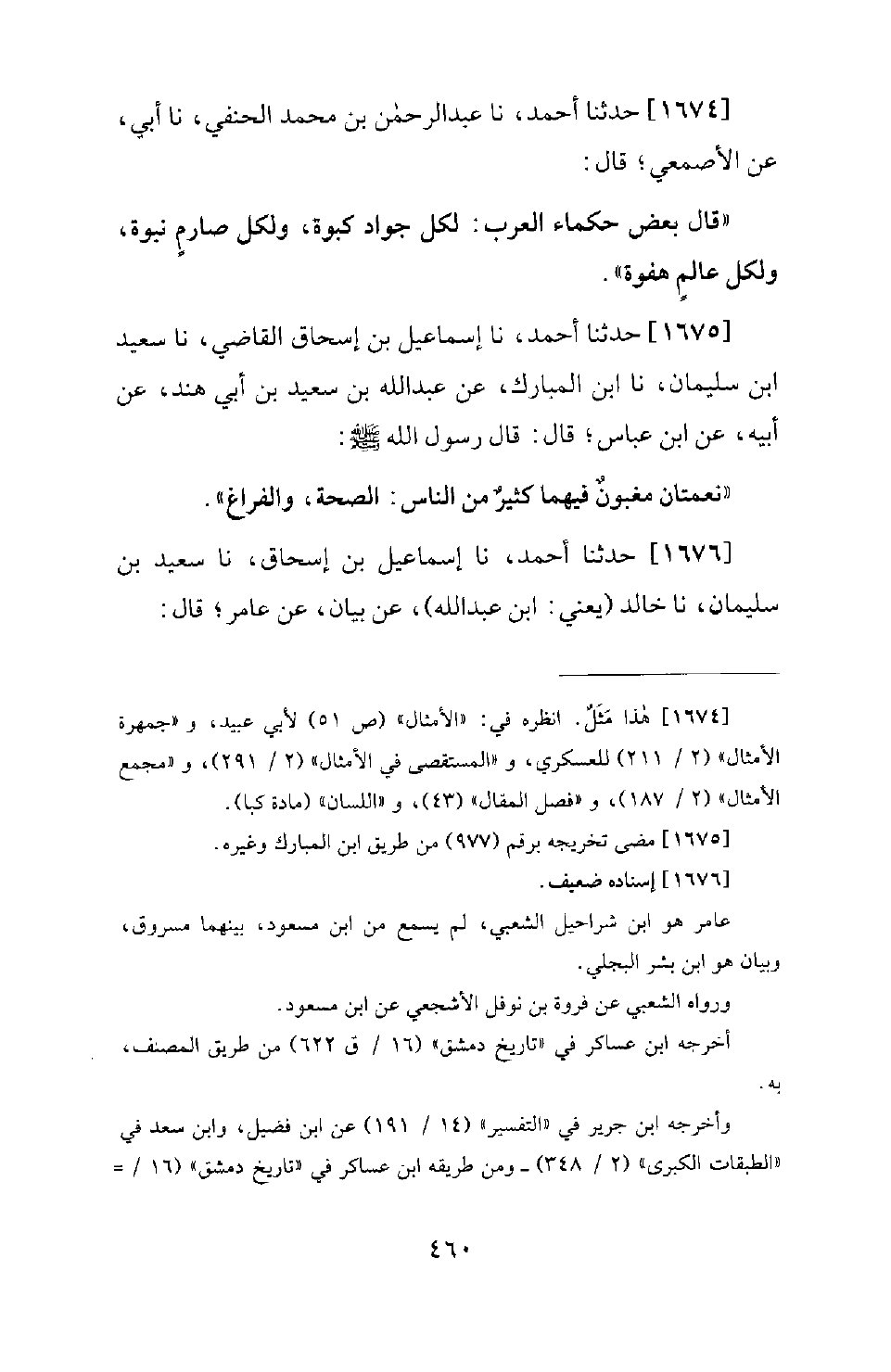 1675 - حَدَّثَنَا أَحْمَدُ، نَا إِسْمَاعِيلُ بْنُ إِسْحَاقَ الْقَاضِي، نَا سَعِيدُ بْنُ سُلَيْمَانَ، نَا ابْنُ الْمُبَارَكِ، عَنْ عَبْدِ اللهِ بْنِ سَعِيدِ بْنِ أَبِي هِنْدٍ، عَنْ أَبِيهِ، عَنِ ابْنِ عَبَّاسٍ؛ قَالَ: قَالَ رَسُولُ اللهِ صَلَّى اللَّهُ عَلَيْهِ وَسَلَّمَ: «نِعْمَتَانِ مَغْبُونٌ فِيهِمَا كَثِيرٌ مِنَ النَّاسِ: الصِّحَّةُ، وَالْفَرَاغُ»