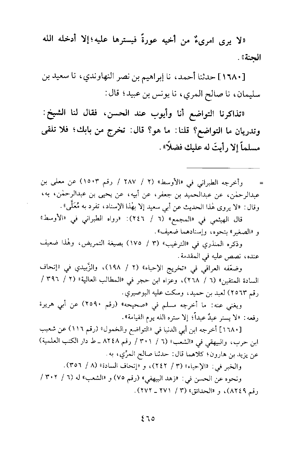 1680 - حَدَّثَنَا أَحْمَدُ، نَا إِبْرَاهِيمُ بْنُ نَصْرٍ النُّهَاوَنْدِيُّ، نَا سَعِيدُ بْنُ سُلَيْمَانَ، نَا صَالِحٌ الْمُرِّيُّ، نَا يُونُسُ بْنُ عُبَيْدٍ؛ قَالَ: تَذَاكَرْنَا التَّوَاضُعَ أَنَا وَأَيُّوبُ عِنْدَ الْحَسَنِ، فَقَالَ لَنَا الشَّيْخُ: وَتَدْرِيَانِ مَا التَّوَاضُعُ؟ قُلْنَا: مَا هُوَ؟ قَالَ: تَخْرُجُ مِنْ بَابِكَ؛ فَلا تَلْقَى مُسْلِمًا إِلا رَأَيْتَ لَهُ عَلَيْكَ فَضْلًا.