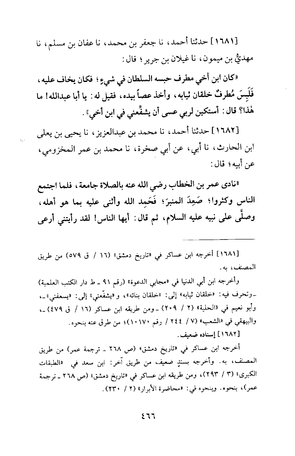 1682 - حَدَّثَنَا أَحْمَدُ، نَا مُحَمَّدُ بْنُ عَبْدِ الْعَزِيزِ، نَا يَحْيَى بْنُ يَعْلَى بْنِ الْحَارِثِ، نَا أَبِي، عَنْ أَبِي صَخْرَةَ، نَا مُحَمَّدُ بْنُ عُمَرَ الْمَخْزُومِيُّ، عَنْ أَبِيهِ؛ قَالَ: نَادَى عُمَرُ بْنُ الْخَطَّابِ رَضِيَ اللهُ عَنْهُ بِالصَّلاةِ جَامِعَةً، فَلَمَّا اجْتَمَعَ النَّاسُ وَكَثُرُوا؛ صَعِدَ الْمِنْبَرَ؛ فَحَمِدَ اللهَ وَأَثْنَى عَلَيْهِ بِمَا هُوَ أَهْلُهُ، وَصَلَّى عَلَى نَبِيِّهِ صَلَّى اللَّهُ عَلَيْهِ وَسَلَّمَ، ثُمَّ قَالَ: أَيُّهَا النَّاسُ! لَقَدْ رَأَيْتُنِي أَرْعَى -[467]- عَلَى خَالاتٍ لِي مِنْ بَنِي مَخْزُومٍ. فَيَقْبِضْنَ لِي الْقَبْضَةَ مِنَ التَّمْرِ أَوِ الزَّبِيبِ، فَأَظَلُّ يَوْمِي وَأَيُّ يَوْمٍ. ثُمَّ نَزَلَ، فَقَالَ لَهُ عَبْدُ الرَّحْمَنِ بْنُ عَوْفٍ: يَا أَمِيرَ الْمُؤْمِنِينَ! مَا زدت على أن قئمت نَفْسَكَ - يَعْنِي: عِبْتَ -. قَالَ: فَقَالَ: وَيْحُكَ يَا ابْنَ عَوْفٍ! إِنِّي خَلَوْتُ؛ فَحَدَّثَتْنِي نفسي؛ قال: أَنْتَ أَمِيرُ الْمُؤْمِنِينَ؛ فَمَنْ ذَا أَفْضَلُ مِنْكَ؟ فَأَرَدْتُ أَنْ أُعَرِّفَهَا نَفْسَهَا