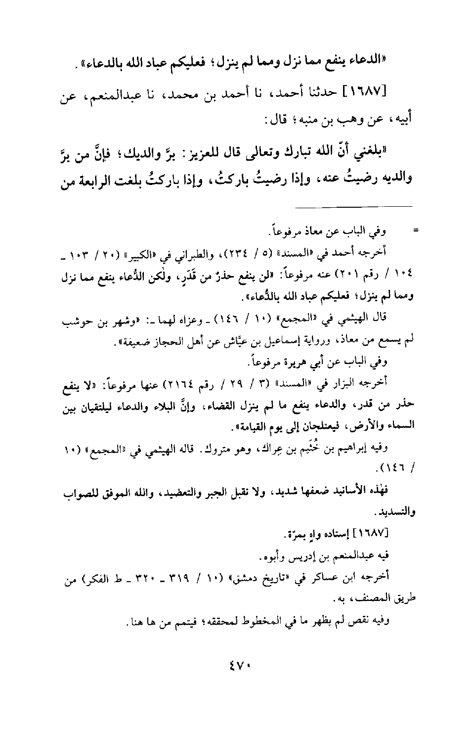 1687 - حَدَّثَنَا أَحْمَدُ، نَا أَحْمَدُ بْنُ مُحَمَّدٍ، نَا عَبْدُ الْمُنْعِمِ، عَنْ أَبِيهِ، عَنْ وَهْبِ بْنِ مُنَبِّهٍ؛ قَالَ: بَلَغَنِي أَنَّ اللهَ تَبَارَكَ وَتَعَالَى قَالَ لِلْعَزِيزِ: بِرَّ وَالِدَيْكَ؛ فَإِنَّ مَنْ بَرَّ وَالِدَيْهِ رَضِيتُ عَنْهُ، وَإِذَا رَضِيتُ بَارَكْتُ، وَإِذَا بَارَكْتُ بَلَغْتُ الرَّابِعَةَ -[471]- مِنَ النَّسْلِ
