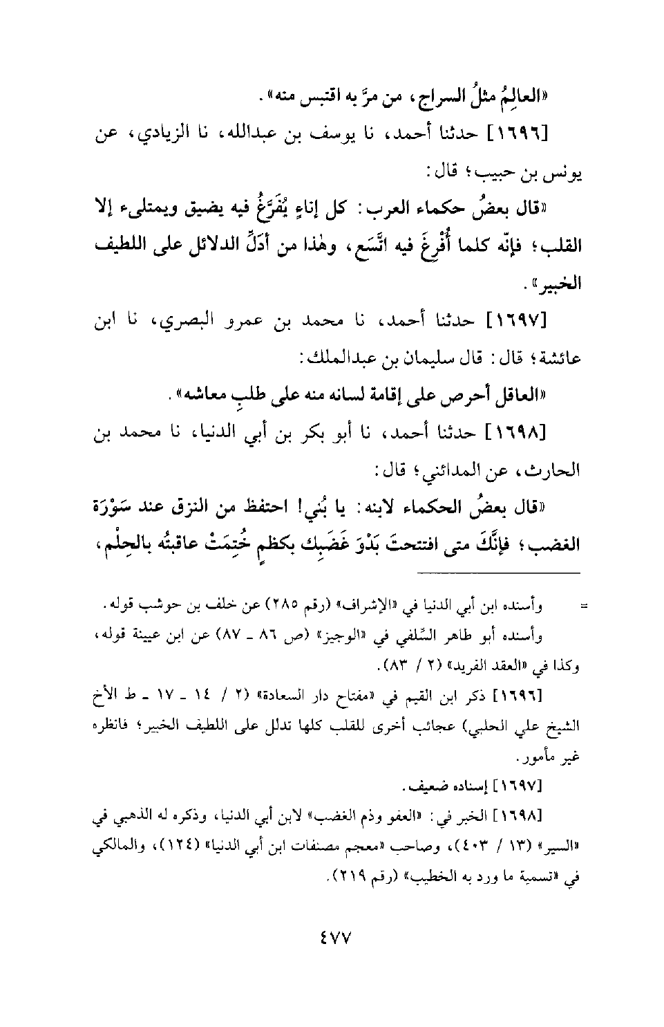 1697 - حَدَّثَنَا أَحْمَدُ، نَا مُحَمَّدُ بْنُ عَمْرٍو الْبَصْرِيُّ، نَا ابْنُ عَائِشَةَ؛ قَالَ: قَالَ سُلَيْمَانُ بْنُ عَبْدِ الْمَلِكِ. الْعَاقِلُ أَحْرَصُ عَلَى إِقَامَةِ لِسَانِهِ مِنْهُ عَلَى طَلَبِ مَعَاشِهِ