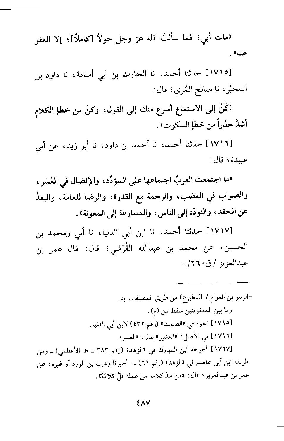 1717 - حَدَّثَنَا أَحْمَدُ، نَا ابْنُ أَبِي الدُّنْيَا، نَا أَبِي وَمُحَمَّدُ بْنُ الْحُسَيْنِ، عَنْ مُحَمَّدِ بْنِ عَبْدِ اللهِ الْقُرَشِيِّ؛ قَالَ: قَالَ عُمَرُ بْنُ عَبْدِ الْعَزِيزِ: -[488]- مَنْ عَلِمَ أَنَّ لِلْكَلامِ ثَوَابًا وَعِقَابًا قَلَّ كَلامُهُ إِلا فِيمَا يَعْنِيهِ.