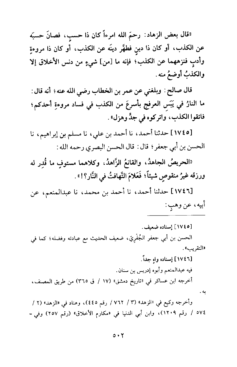1745 - حَدَّثَنَا أَحْمَدُ، نَا أَحْمَدُ بْنُ عَلِيٍّ، نَا مُسْلِمُ بْنُ إِبْرَاهِيمَ، نَا الْحَسَنُ بْنُ أَبِي جَعْفَرٍ؛ قَالَ: قَالَ الْحَسَنُ الْبَصْرِيُّ رَحِمَهُ اللهُ: الْحَرِيصُ الْجَاهِدُ، وَالْقَانِعُ الزَّاهِدُ، وَكِلاهُمَا مُسْتَوْفٍ مَا قُدِّرَ لَهُ وَرِزْقُهُ غَيْرُ مَنْقُوصٍ شَيْئًا؛ فَعَلامَ التَّهَافُتُ فِي النَّارِ؟ !