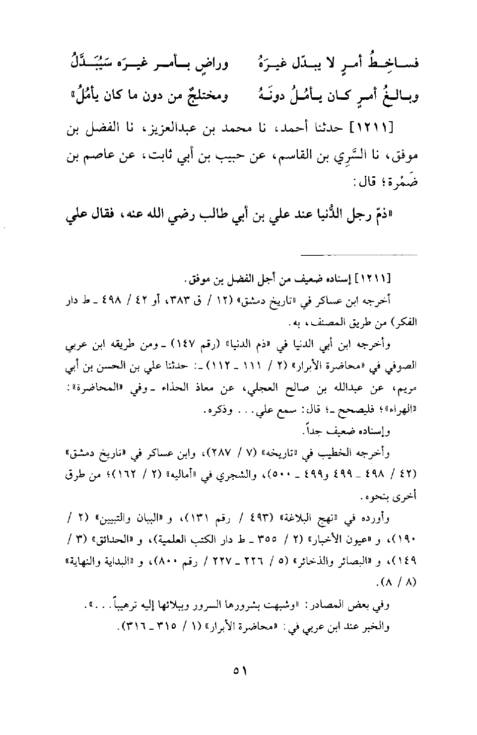 1211 - حَدَّثَنَا أَحْمَدُ، نَا مُحَمَّدُ بْنُ عَبْدِ الْعَزِيزِ، نَا الْفَضْلُ بْنُ مُوَفَّقٍ نَا السَّرِيُّ بْنُ الْقَاسِمِ، عَنْ حَبِيبِ بْنِ أَبِي ثَابِتٍ، عَنْ عَاصِمِ بْنِ ضَمْرَةَ؛ قَالَ: ذَمَّ رَجُلٌ الدُّنْيَا عِنْدَ عَلِيِّ بْنِ أَبِي طَالِبٍ رَضِيَ اللهُ عَنْهُ، فَقَالَ عَلِيٌّ -[52]- رَضِيَ اللهُ عَنْهُ: الدُّنْيَا دَارُ صِدْقٍ لِمَنْ صَدَقَهَا، وَدَارُ نَجَاةٍ لِمَنْ فَهِمَ عَنْهَا، وَدَارُ غِنًى لِمَنْ تَزَوَّدَ مِنْهَا، مَهْبَطُ وَحْيِ اللهِ، وَمُصَلَّى مَلائِكَتِهِ، وَمَسْجِدُ أَنْبِيَائِهِ، وَمَتْجَرُ أَوْلِيَائِهِ، رَبِحُوا فِيهَا الرَّحْمَةَ، وَاكْتَسَبُوا فِيهَا الْجَنَّةَ، فَمَنْ ذَا يَذُمُّهَا وَقَدْ أَذِنَتْ بِبَيْنِهَا، وَنَادَتْ بفراقها، وشبهت بسرورها وَبِبَلائِهَا الْبَلاءَ؛ تَرْهِيبًا وَتَرْغِيبًا، فَيَا أَيُّهَا الذَّامُّ لِلدُّنْيَا، الْمُعَلِّلُ نَفْسَهُ! مَتَى خَدَعَتْكَ الدُّنْيَا أَوْ مَتَى اسْتَدَامَتْ إِلَيْكَ؟ ! أَبِمُصَارِعِ آبَائِكَ فِي الْبَلَى، أَمْ بِمُصَارِعِ أُمَّهَاتِكَ تَحْتَ الثَّرَى؟ ! كَمْ مَرَّضْتَ بِيَدَيْكَ وَعَلَّلْتَ بِكَفَّيْكَ، تَطْلُبُ لَهُ الشِّفَاءَ وَتَسْتَوْصِفُ لَهُ الْأَطِبَّاءَ، لا يُغْنِي عَنْكَ دَوَاؤُكَ، وَلا يَنْفَعُكَ بُكَاؤُكَ
