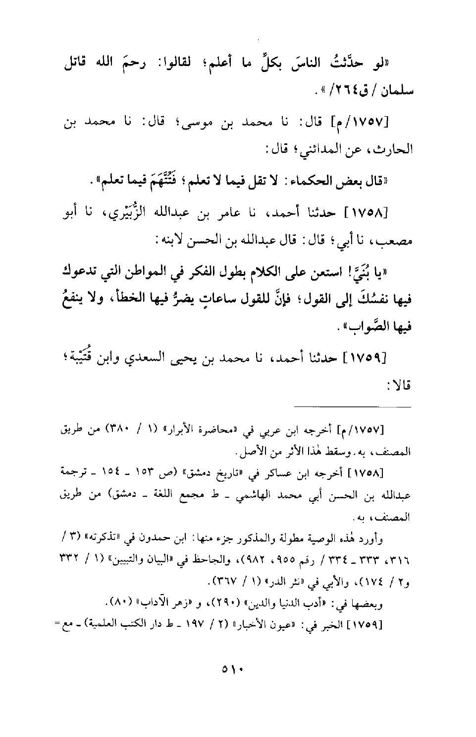1758 - حَدَّثَنَا أَحْمَدُ، نَا عَامِرُ بْنُ عَبْدِ اللهِ الزُّبَيْرِيُّ، نَا أَبُو مُصْعَبٍ، نَا أَبِي؛ قَالَ: قَالَ عَبْدُ اللهِ بْنُ الْحَسَنِ لابْنِهِ: يَا بُنَيَّ! اسْتَعِنْ عَلَى الْكَلامِ بِطُولِ الْفِكْرِ فِي الْمَوَاطِنِ الَّتِي تَدْعُوكَ فِيهَا نَفْسُكَ إِلَى الْقَوْلِ؛ فَإِنَّ لِلْقَوْلِ سَاعَاتٍ يَضُرُّ فِيهَا الْخَطَأُ، وَلا يَنْفَعُ فِيهَا الصَّوَابُ.