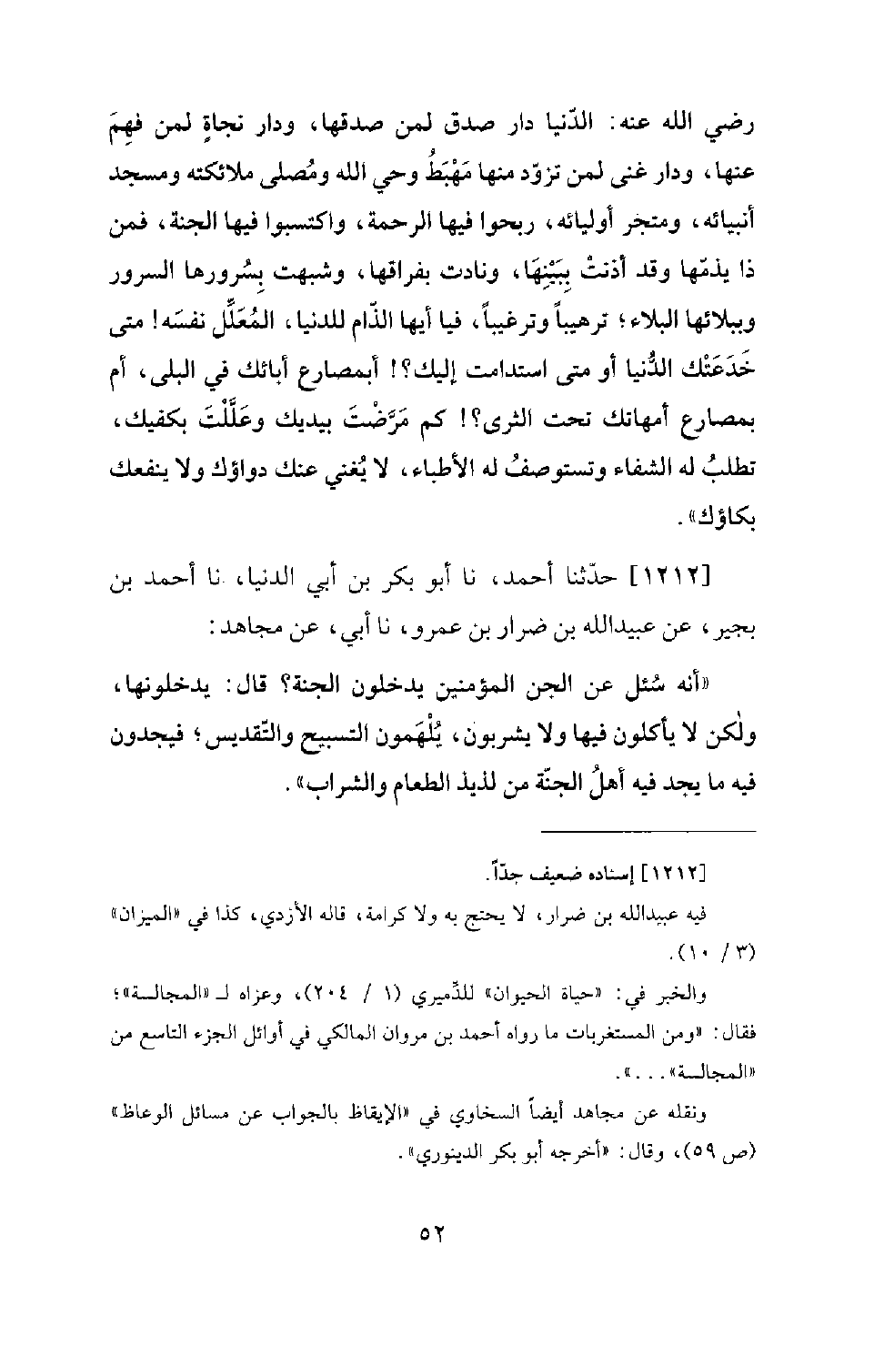 1212 - حَدَّثَنَا أَحْمَدُ، نَا أَبُو بَكْرِ بْنُ أَبِي الدُّنْيَا، نَا أَحْمَدُ بْنُ بُجَيْرٍ، عَنْ عُبَيْدِ اللهِ بْنِ ضِرَارِ بْنِ عَمْرٍو، نَا أَبِي، عَنْ مُجَاهِدٍ: أَنَّهُ سُئِلَ عَنِ الْجِنِّ الْمُؤْمِنِينَ يَدْخُلُونَ الْجَنَّةَ؟ قَالَ: يَدْخُلُونَهَا، وَلَكِنْ لا يَأْكُلُونَ فِيهَا وَلا يَشْرَبُونَ، يُلْهَمُونَ التَّسْبِيحَ وَالتَّقْدِيسَ؛ فَيَجِدُونَ فِيهِ مَا يَجِدُ فِيهِ أَهْلُ الْجَنَّةِ مِنْ لَذِيذِ الطَّعَامِ وَالشَّرَابِ