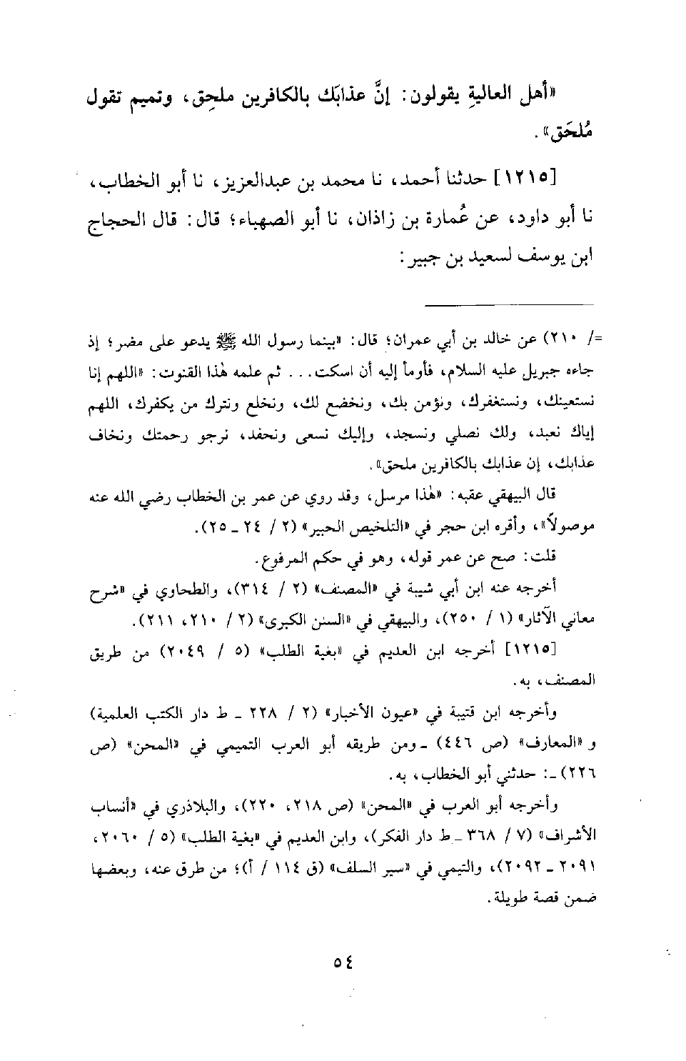 1215 - حَدَّثَنَا أَحْمَدُ، نَا مُحَمَّدُ بْنُ عَبْدِ الْعَزِيزِ، نَا أَبُو الْخَطَّابِ، نَا أَبُو دَاوُدَ، عَنْ عُمَارَةَ بْنِ زَاذَانَ، نَا أَبُو الصَّهْبَاءِ؛ قَالَ: قَالَ الْحَجَّاجُ بْنُ يُوسُفَ لِسَعِيدِ بْنِ جُبَيْرٍ: -[55]- اخْتَرْ أَيَّ قَتْلةٍ شِئْتَ. فَقَالَ لَهُ سَعِيدُ بْنُ جُبَيْرٍ: بَلْ أَنْتَ؛ فَاخْتَرْ لِنَفْسِكَ؛ فَإِنَّ الْقِصَاصَ أَمَامَكَ.