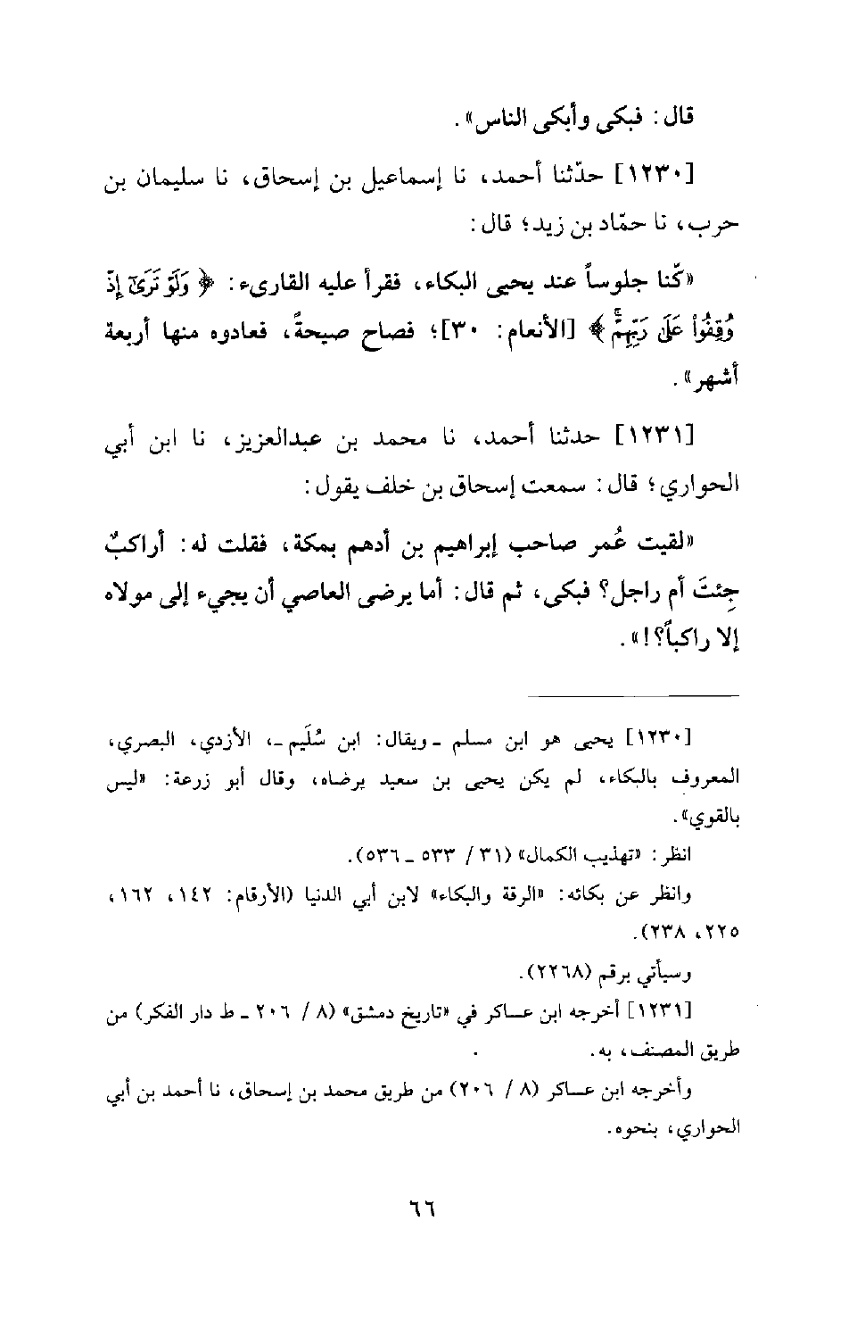 1230 - حَدَّثَنَا أَحْمَدُ، نَا إِسْمَاعِيلُ بْنُ إِسْحَاقَ، نَا سُلَيْمَانُ بْنُ حَرْبٍ، نَا حَمَّادُ بْنُ زَيْدٍ؛ قَالَ: كُنَّا جُلُوسًا عِنْدَ يَحْيَى الْبَكَّاءِ، فَقَرَأَ عَلَيْهِ الْقَارِئُ: {وَلَوْ تَرَى إِذْ وُقِفُوا عَلَى رَبِّهِمْ} [الأنعام: 30] ؛ فَصَاحَ صَيْحَةً، فَعَادُوهُ مِنْهَا أَرْبَعَةَ أَشْهُرٍ.