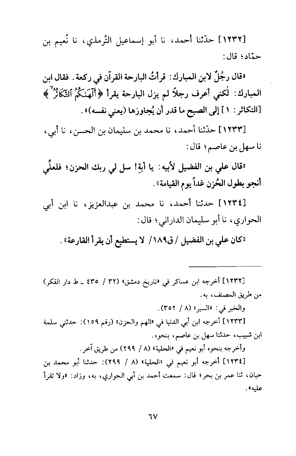 1232 - حَدَّثَنَا أَحْمَدُ، نَا أَبُو إِسْمَاعِيلَ التِّرْمِذِيُّ، نَا نُعَيْمُ بْنُ حَمَّادٍ؛ قَالَ: قَالَ رَجُلٌ لِابْنِ الْمُبَارَكِ: قَرَأْتُ الْبَارِحَةَ الْقُرْآنَ فِي رَكْعَةٍ. فَقَالَ ابْنُ الْمُبَارَكِ: لَكِنِّي أَعْرِفُ رَجُلًا لَمْ يَزَلِ الْبَارِحَةَ يقرأ: (أَلْهكُمُ التَّكَاثُرُ) (1)) [التَّكَاثُرُ: 1] إِلَى الصُّبْحِ مَا قَدِرَ أَنْ يُجَاوِزَهَا (يَعْنِي نَفْسَهُ) .