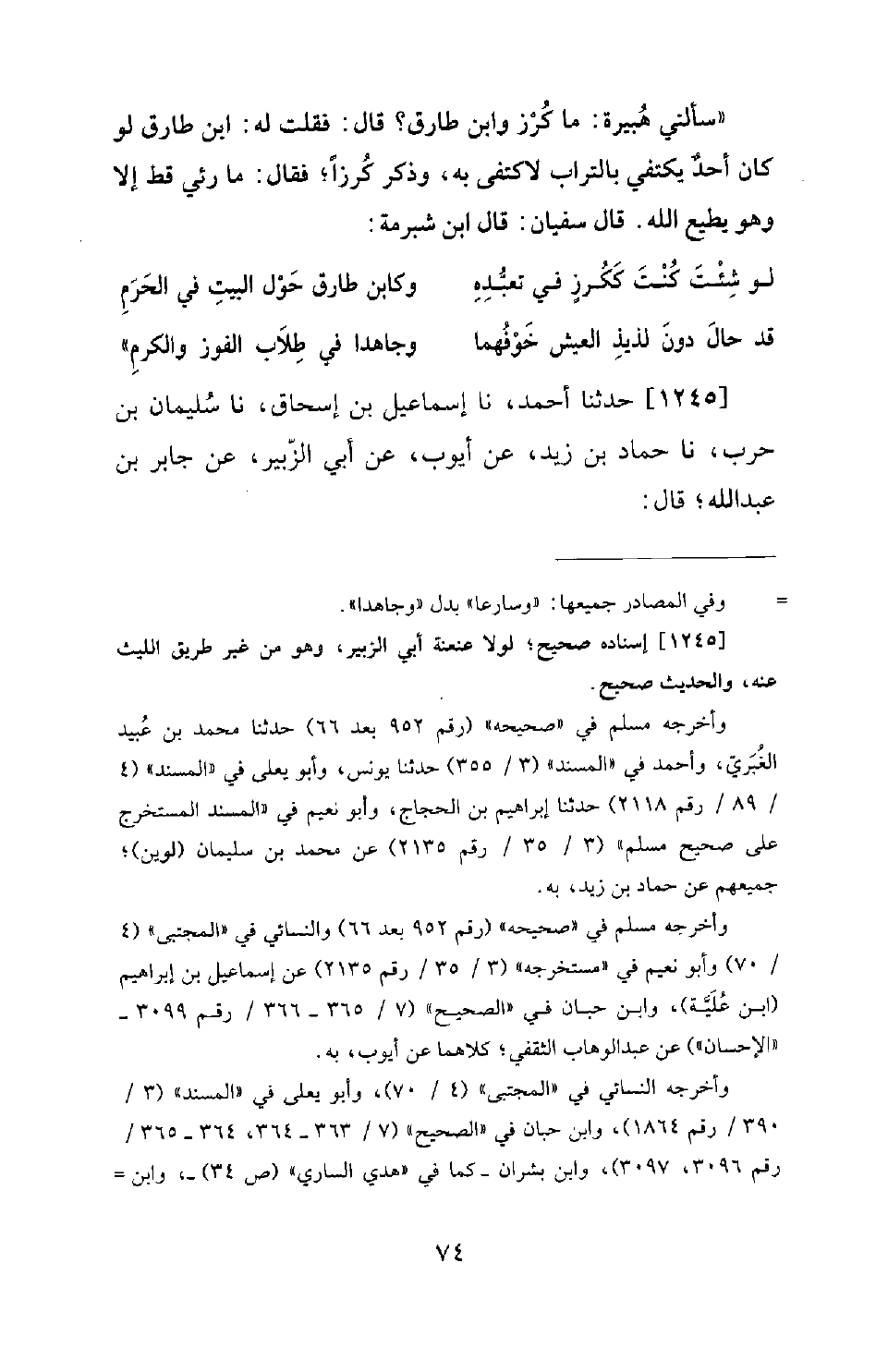 1245 - حَدَّثَنَا أَحْمَدُ، نَا إِسْمَاعِيلُ بْنُ إِسْحَاقَ، نَا سُلَيْمَانُ بْنُ حَرْبٍ، نَا حَمَّادُ بْنُ زَيْدٍ، عَنْ أَيُّوبَ، عَنْ أَبِي الزُّبَيْرِ، عَنْ جَابِرِ بْنِ عَبْدِ اللهِ؛ قَالَ: -[75]- صَلَّى رَسُولُ اللهِ صَلَّى اللَّهُ عَلَيْهِ وَسَلَّمَ عَلَى النَّجَاشِيِّ، صَفَّنَا صَفَّيْنِ