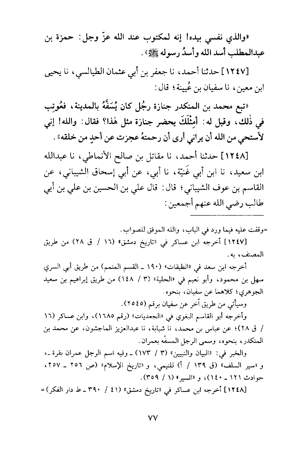 1247 - حَدَّثَنَا أَحْمَدُ، نَا جَعْفَرُ بْنُ أَبِي عُثْمَانَ الطَّيَالِسِيُّ، نَا يَحْيَى بْنُ مَعِينٍ، نَا سُفْيَانُ بْنُ عُيَيْنَةَ؛ قَالَ: تَبِعَ مُحَمَّدُ بن المنكدرجنازة رَجُلٍ كَانَ يُسَفَّهُ بِالْمَدِينَةِ، فَعُوتِبَ فِي ذَلِكَ، وَقِيلَ لَهُ: أَمِثْلُكَ يَحْضُرُ جِنَازَةً مِثْلَ هَذَا؟ فَقَالَ: وَاللهِ! إني لأستحي مِنَ اللهِ أَنْ يَرَانِي أَرَى أَنَّ رَحْمَتَهُ عَجَزَتْ عَنْ أَحَدٍ مِنْ خَلْقِهِ.