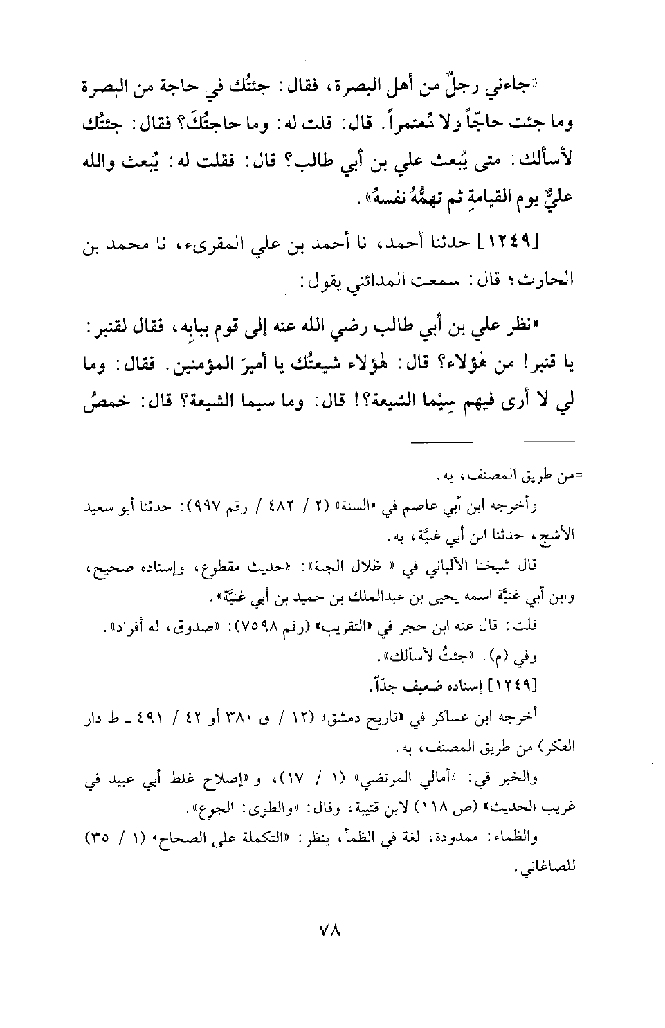 1249 - حَدَّثَنَا أَحْمَدُ، نَا أَحْمَدُ بْنُ عَلِيٍّ الْمُقْرِئُ، نَا مُحَمَّدُ بْنُ الْحَارِثِ؛ قَالَ: سَمِعْتُ الْمَدَائِنِيَّ يَقُولُ: نَظَرَ عَلِيُّ بْنُ أَبِي طَالِبٍ رَضِيَ اللهُ عَنْهُ إِلَى قَوْمٍ بِبَابِهِ، فَقَالَ لِقَنْبَرٍ: يَا قَنْبَرُ! مَنْ هَؤُلاءِ؟ قَالَ: هَؤُلاءِ شِيعَتُكَ يَا أَمِيرَ الْمُؤْمِنِينَ. فَقَالَ: وَمَا لِي لا أَرَى فِيهِمْ سِيمَا الشِّيعَةِ؟ ! قَالَ: وَمَا سِيمَا الشِّيعَةِ؟ قَالَ: خُمْصُ -[79]- الْبُطُونِ مِنَ الطَّوَى، يُبْسُ الشِّفَاهِ مِنَ الظَّمَأِ، عُمْشُ الْعُيُونِ مِنَ الْبُكَاءِ