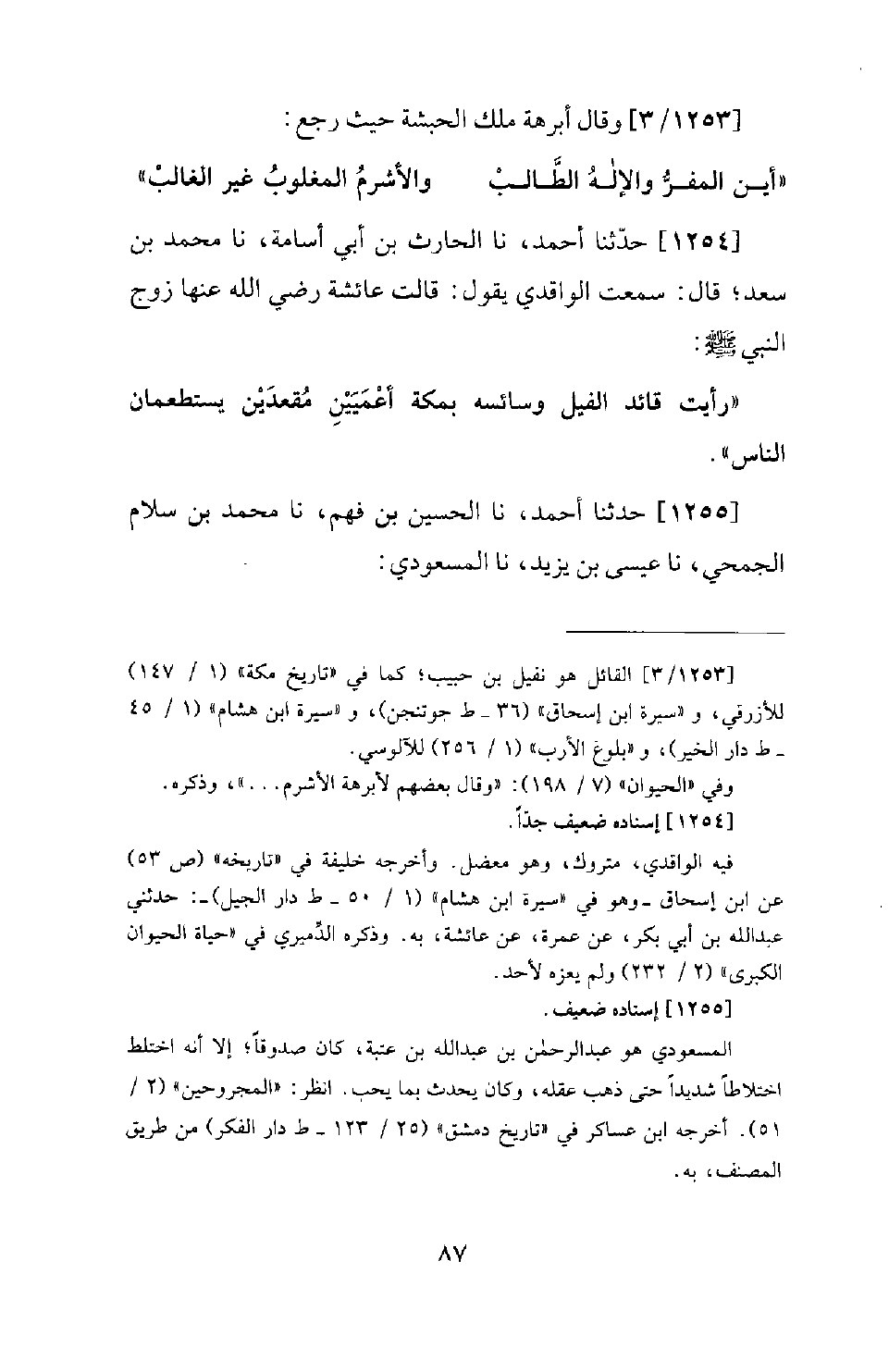 1254 - حَدَّثَنَا أَحْمَدُ، نَا الْحَارِثُ بْنُ أَبِي أُسَامَةَ، نَا مُحَمَّدُ بْنُ سَعْدٍ؛ قَالَ: سَمِعْتُ الْوَاقِدِيَّ يَقُولُ: قَالَتْ عَائِشَةُ رَضِيَ اللهُ عَنْهَا زَوْجُ النَّبِيِّ صَلَّى اللَّهُ عَلَيْهِ وَسَلَّمَ: رَأَيْتُ قَائِدَ الْفِيلِ وَسَائِسَهُ بِمَكَّةَ أَعْمَيَيْنِ مُقْعَدَيْنِ يَسْتَطْعِمَانِ النَّاسَ