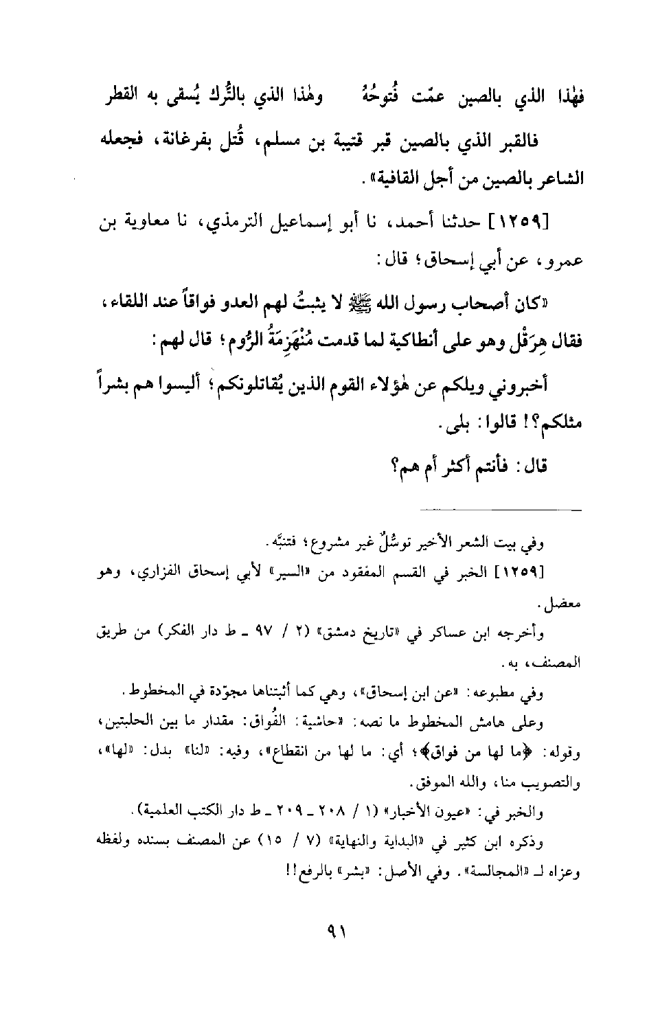 1259 - حَدَّثَنَا أَحْمَدُ، نا أبو إِسْمَاعِيلُ التِّرْمِذِيُّ، نَا مُعَاوِيَةُ بْنُ عَمْرٍو، عَنْ أَبِي إِسْحَاقَ؛ قَالَ: كَانَ أَصْحَابُ رَسُولِ اللهِ صَلَّى اللَّهُ عَلَيْهِ وَسَلَّمَ لا يَثْبُتُ لَهُمُ الْعَدُوُّ فَوَاقًا عِنْدَ اللِّقَاءِ، فَقَالَ هِرَقْلُ وَهُوَ عَلَى أَنْطَاكِيَةَ لَمَّا قَدِمَتْ مُنْهَزِمَةً الرُّومُ؛ قَالَ لَهُمْ: أَخْبِرُونِي وَيْلَكُمْ عَنْ هَؤُلاءِ الْقَوْمِ الَّذِينَ يُقَاتِلُونَكُمْ؛ أَلَيْسُوا هُمْ بَشَرًا مِثْلَكُمْ؟ ! قَالُوا: بَلَى. قَالَ: فَأَنْتُمْ أَكْثَرُ أَمْ هُمْ؟ -[92]- قَالُوا: بَلْ نَحْنُ أَكْثَرُ مِنْهُمْ أَضْعَافًا فِي كُلِّ مَوْطِنٍ. قَالَ فَمَا بَالُكُمْ تَنْهَزِمُونَ كُلَّمَا لَقِيتُمُوهُمْ؟ فَقَالَ شَيْخٌ مِنْ عُظَمَائِهِمْ: مِنْ أَجْلِ أَنَّهُمْ يَقُومُونَ اللَّيْلَ، وَيَصُومُونَ النَّهَارَ، وَيُوفُونَ بِالْعَهْدِ، وَيَأْمُرُونَ بِالْمَعْرُوفِ، وَيَنْهَوْنَ عَنِ الْمُنْكَرِ، وَيَتَنَاصَفُونَ بَيْنَهُمْ، وَمِنْ أَجْلِ أَنَّا نَشْرَبُ الْخَمْرَ، وَنَزْنِي، وَنَرْكَبُ الْحَرَامَ، وَنَنْقُضُ الْعَهْدَ، وَنَغْصَبُ، وَنَظْلِمُ، وَنَأْمُرُ بِمَا يُسْخِطُ اللهَ، وَنَنْهَى عَمَّا يُرْضِي اللهَ عَزَّ وَجَلَّ، وَنُفْسِدُ فِي الْأَرْضِ. قَالَ: أَنْتَ صَدَقْتَنِي.