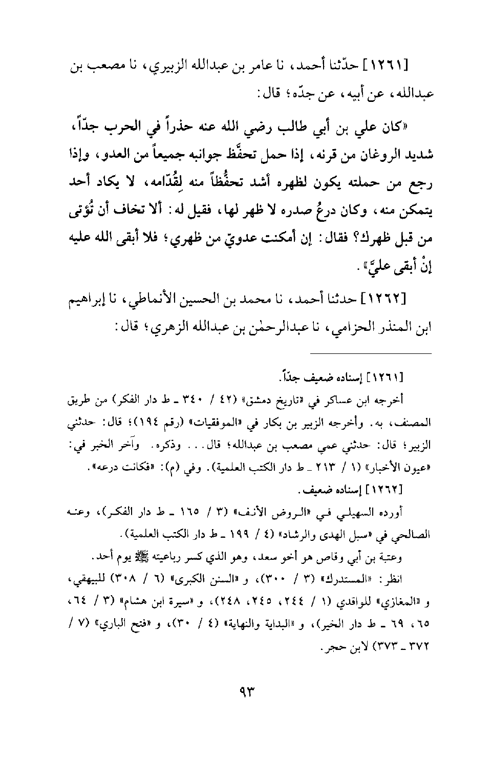 1261 - حَدَّثَنَا أَحْمَدُ، نَا عَامِرُ بْنُ عَبْدِ اللهِ الزُّبَيْرِيُّ، نَا مُصْعَبُ بْنُ عَبْدِ اللهِ، عَنْ أَبِيهِ، عَنْ جَدِّهِ؛ قَالَ: كَانَ عَلِيُّ بْنُ أَبِي طَالِبٍ رَضِيَ اللهُ عَنْهُ حَذِرًا فِي الْحَرْبِ جِدًّا، شَدِيدَ الرَّوَغَانِ مِنْ قَرْنِهِ، إِذَا حَمَلَ تَحَفَّظَ جَوَانِبَهُ جَمِيعًا مِنَ الْعَدُوِّ، وَإِذَا رَجَعَ مِنْ حَمْلَتِهِ يَكُونُ لِظَهْرِهِ أَشَدَّ تَحَفُّظًا مِنْهُ لِقُدَّامِهِ، لا يَكَادُ أَحَدٌ يَتَمَكَّنُ مِنْهُ، وَكَانَ دِرْعُ صَدْرِهِ لا ظَهْرَ لَهَا، فَقِيلَ لَهُ: أَلا تَخَافُ أَنْ تُؤْتَى مِنْ قِبَلِ ظَهْرِكَ؟ فَقَالَ: إِنْ أَمْكَنْتُ عَدُوِّي مِنْ ظَهْرِي؟ فَلا أَبْقَى الله عَلَيْهِ إِنْ أَبْقَى عَلَيَّ