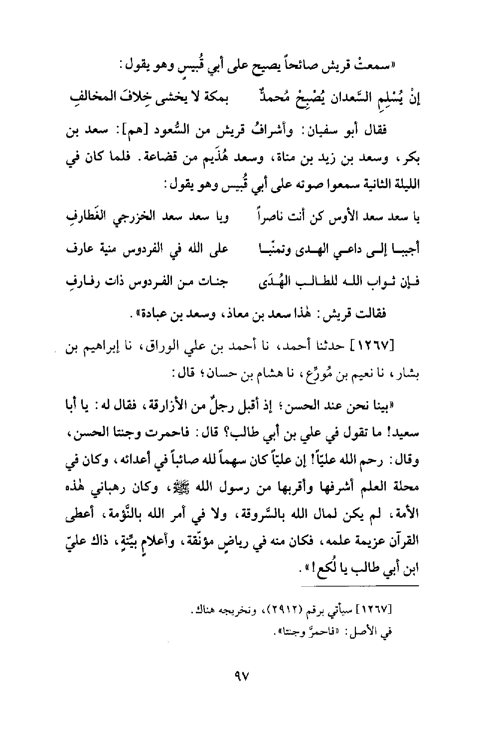 1267 - حَدَّثَنَا أَحْمَدُ، نَا أَحْمَدُ بْنُ عَلِيٍّ الْوَرَّاقُ، نَا إِبْرَاهِيمُ بْنُ بَشَّارٍ، نَا نُعَيْمُ بْنُ مُوَرِّعٍ، نَا هِشَامُ بْنُ حَسَّانٍ؛ قَالَ: بَيْنَا نَحْنُ عِنْدَ الْحَسَنِ؛ إِذْ أَقْبَلَ رَجُلٌ مِنَ الْأَزَارِقَةِ، فَقَالَ لَهُ: يَا أَبَا سَعِيدٍ! مَا تَقُولُ فِي عَلِيِّ بْنِ أَبِي طَالِبٍ؟ قَالَ: فَاحْمَرَّتْ وَجْنَتَا الْحَسَنِ، وَقَالَ: رَحِمَ اللهُ عَلِيًّا! إِنَّ عَلِيًّا كَانَ سَهْمًا لِلَّهِ صَائِبًا فِي أَعْدَائِهِ، وَكَانَ فِي مَحَلَّةِ الْعِلْمِ أَشْرَفَهَا وَأَقْرَبَهَا مِنْ رَسُولِ اللهِ صَلَّى اللَّهُ عَلَيْهِ وَسَلَّمَ، وَكَانَ رَهْبَانِيَّ هَذِهِ الْأُمَّةِ، لَمْ يَكُنْ لِمَالِ اللهِ بِالسَّرُوقَةِ، وَلا فِي أَمْرِ اللهِ بِالنَّؤُمَةِ، أَعْطَى الْقُرْآنَ عَزِيمَةَ عِلْمِهِ، فَكَانَ مِنْهُ فِي رِيَاضٍ مُؤَنَّقَةٍ، وَأَعْلامٍ بَيِّنَةٍ، ذَاكَ عَلِيُّ بْنُ أَبِي طَالِبٍ يَا لُكَعُ!