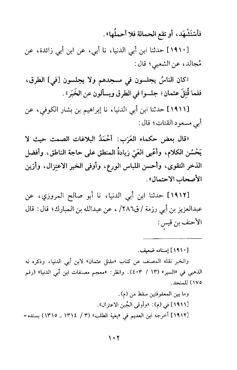 1911 - حَدَّثَنَا ابْنُ أَبِي الدُّنْيَا، نَا إِبْرَاهِيمُ بْنُ بَشَّارٍ الْكُوفِيُّ، عَنْ أَبِي مَسْعُودٍ الْقَتَّاتِ؛ قَالَ: قَالَ بَعْضُ حُكَمَاءِ الْعَرَبِ: أَحْمَدُ الْبَلَاغَاتِ الصَّمْتُ حَيْثُ لَا يَحْسُنُ الْكَلَامُ، وَأَعْيَى الْعِيِّ زِيَادَةُ الْمَنْطِقِ عَلَى حَاجَةِ النَّاطِقِ، وَأَفْضَلُ الذُّخْرِ التَّقْوَى، وَأَحْسَنُ اللِّبَاسِ الْوَرَعُ، وَأَوْفَى الْخَيْرِ الِاعْتِزَالُ، وَأَزْيَنُ الْأَصْحَابِ الِاحْتِمَالُ.