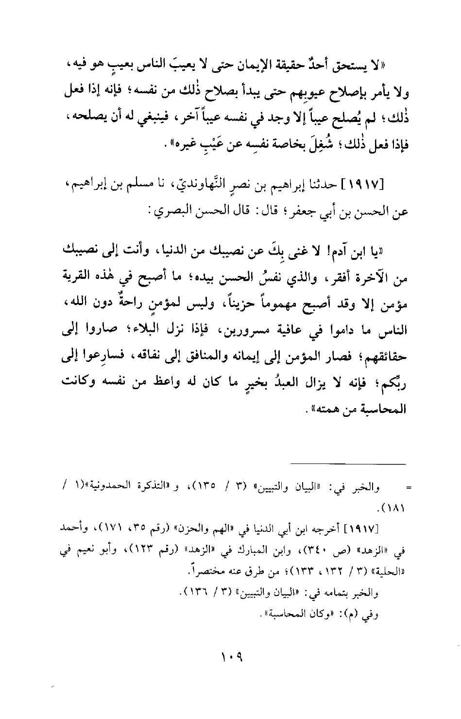 1917 - حَدَّثَنَا إِبْرَاهِيمُ بْنُ نَصْرٍ النَّهَاوَنْدِيُّ، نَا مُسْلِمُ بْنُ إِبْرَاهِيمُ، عَنِ الْحَسَنِ بْنِ أَبِي جَعْفَرٍ؛ قَالَ: قَالَ الْحَسَنُ الْبَصْرِيّ: يَا ابْنَ آدَمَ لَا غِنَى بِكَ عَنْ نَصِيبِكَ مِنَ الدُّنْيَا، وَأَنْتَ إِلَى نَصِيبِكَ مِنَ الْآخِرَةِ أَفْقَرُ، وَالَّذِي نَفْسُ الْحَسَنِ بِيَدِهِ؛ مَا أَصْبَحَ فِي هَذِهِ الْقَرْيَةِ مُؤْمِنٌ إِلَّا وَقَدْ أَصْبَحَ مَهْمُومًا حَزِينًا، وَلَيْسَ لِمُؤْمِنٍ رَاحَةٌ دُونَ اللهِ، النَّاسُ مَا دَامُوا فِي عَافِيَةٍ مَسْرُورِينَ، فَإِذَا نَزَلَ الْبَلَاءُ؛ صَارُوا إِلَى حَقَائِقِهِمْ؛ فَصَارَ الْمُؤْمِنُ إِلَى إِيمَانِهِ وَالْمُنَافِقُ إِلَى نِفَاقِهِ، فَسَارِعُوا إِلَى رَبِّكُمْ؛ فَإِنَّهُ لَا يَزَالُ الْعَبْدُ بِخَيْرٍ مَا كَانَ لَهُ وَاعِظٌ مِنْ نَفْسِهِ، وَكَانَتِ الْمُحَاسَبَةُ مِنْ هِمَّتِهِ.