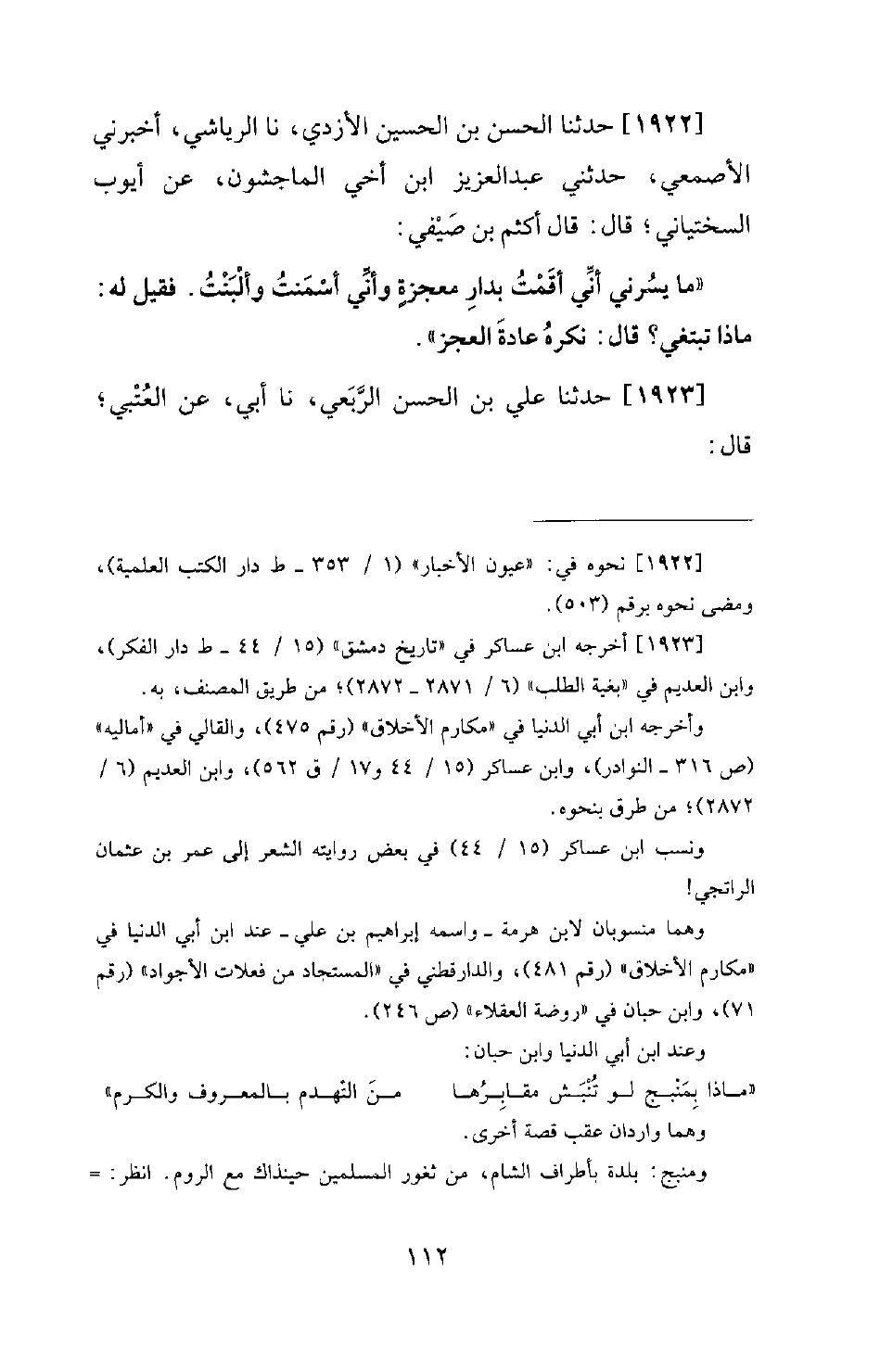 1922 - حَدَّثَنَا الْحَسَنُ بْنُ الْحُسَيْنِ الْأَزْدِيُّ، نَا الرِّيَاشِيُّ، أَخْبَرَنِي الْأَصْمَعِيُّ، حَدَّثَنِي عَبْدُ الْعَزِيزِ ابْنِ أَخِي الْمَاجِشُونَ، عَنْ أَيُّوبَ السِّخْتِيَانِيِّ؛ قَالَ: قَالَ أَكْثَمُ بْنُ صَيْفِيِّ: مَا يَسُرُّنِي أَنِّي أَقَمْتُ بِدَارِ مُعْجِزَةٍ وَأَنِّي أَسْمَنْتُ وَأَلْبَنْتُ. فَقِيلَ لَهُ: مَاذَا تَبْتَغِي؟ قَالَ: نَكْرَهُ عَادَةَ الْعَجَزِ.