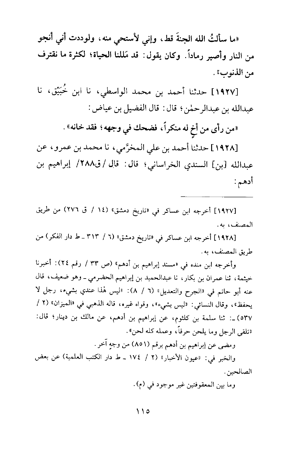 1928 - حَدَّثَنَا أَحْمَدُ بْنُ عَلِيٍّ الْمُخَرِّمِيُّ، نَا مُحَمَّدُ بْنُ عَمْرٍو، عَنْ عَبْدِ اللهِ بْنِ السِّنْدِيِّ الْخُرَاسَانِيِّ؛ قَالَ: قَالَ إِبْرَاهِيمُ بْنُ أَدْهَمَ: -[116]- أَعْرَبْنَا فِي الْكَلَامِ؛ فَلَمْ نُلْحِنْ، وَلَحَنَّا فِي الْأَعْمَالِ؛ فَلَمْ نُعْرِبْ.
