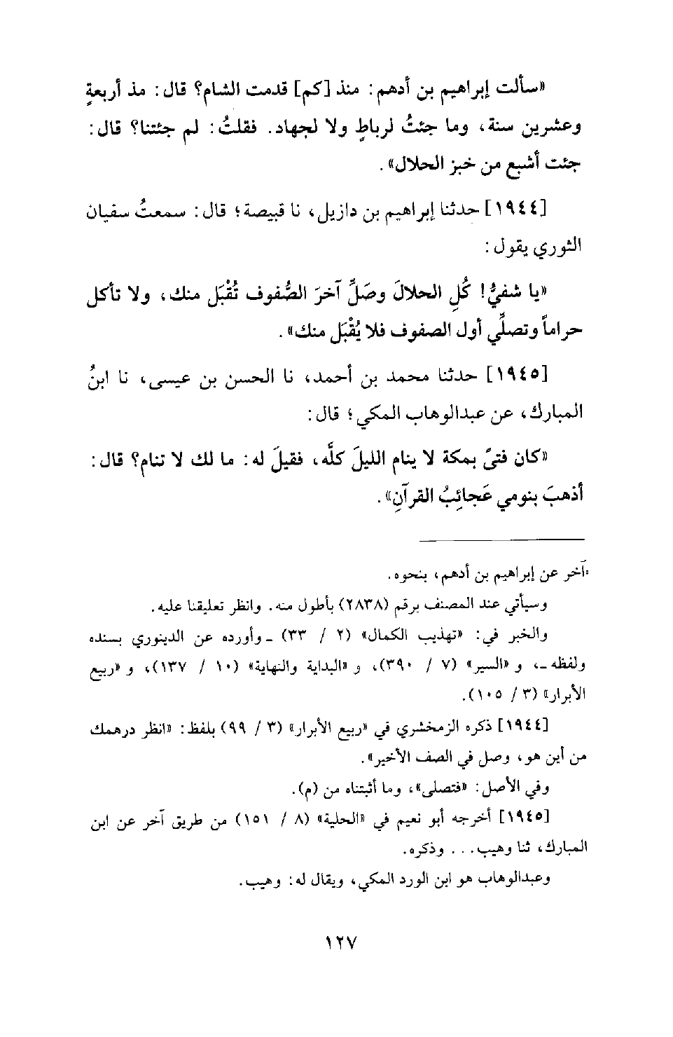1944 - حَدَّثَنَا إِبْرَاهِيمُ بْنُ دَازِيلَ، نَا قُبَيْصَةَ؛ قَالَ: سَمِعْتُ سُفْيَانَ الثَّوْرِيَّ يَقُولُ: يَا شَفِيُّ! كُلِ الْحَلَالِ وَصَلِّ آخِرَ الصُّفُوفِ تُقْبَلُ مِنْكَ، وَلَا تَأْكُلَ حَرَامًا وَتُصَلِّي أَوَّلَ الصُّفُوفِ فَلَا يُقْبَلُ مِنْكَ.