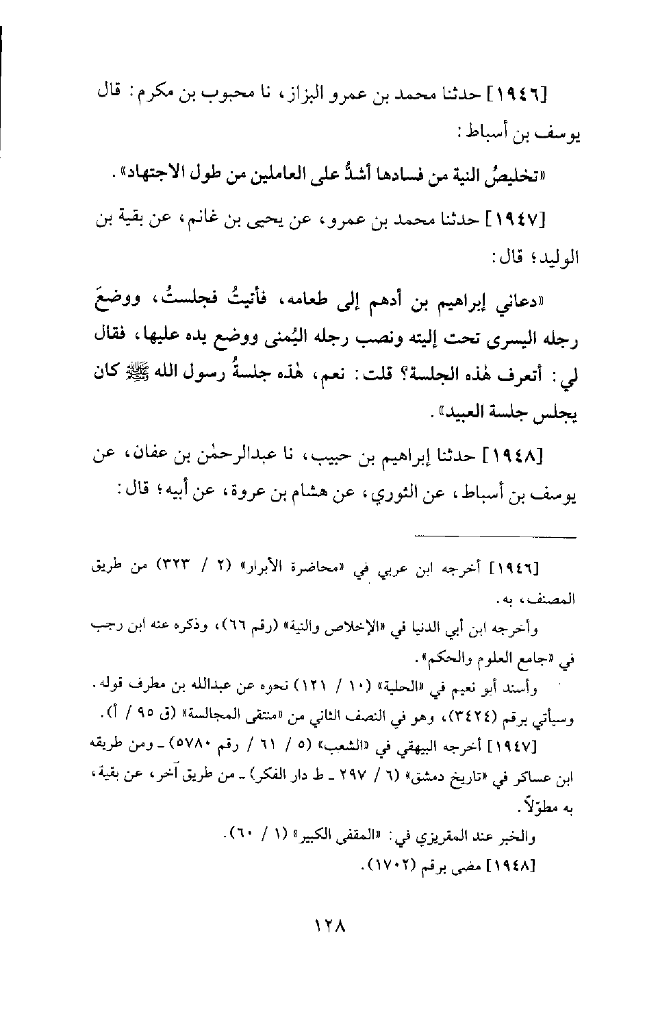 1947 - حَدَّثَنَا مُحَمَّدُ بْنُ عَمْرٍو، عَنْ يَحْيَى بْنِ غَانِمٍ، عَنْ بَقِيَّةَ بْنِ الْوَلِيدِ؛ قَالَ: دَعَانِي إِبْرَاهِيمُ بْنُ أَدْهَمَ إِلَى طَعَامِهِ، فَأَتَيْتُ فَجَلَسْتُ، وَوَضَعَ رِجْلَهُ الْيُسْرَى تَحْتَ إِلْيَتِهِ وَنَصَبَ رِجْلَهُ الْيُمْنَى وَوَضَعَ يَدَهُ عَلَيْهَا، فَقَالَ لِي: أَتَعْرِفُ هَذِهِ الْجِلْسَةَ؟ قُلْتُ: نَعَمْ، هَذِهِ جِلْسَةُ رَسُولِ اللهِ صَلَّى اللَّهُ عَلَيْهِ وَسَلَّمَ، كَانَ يَجْلِسُ جِلْسَةَ الْعَبِيدِ.