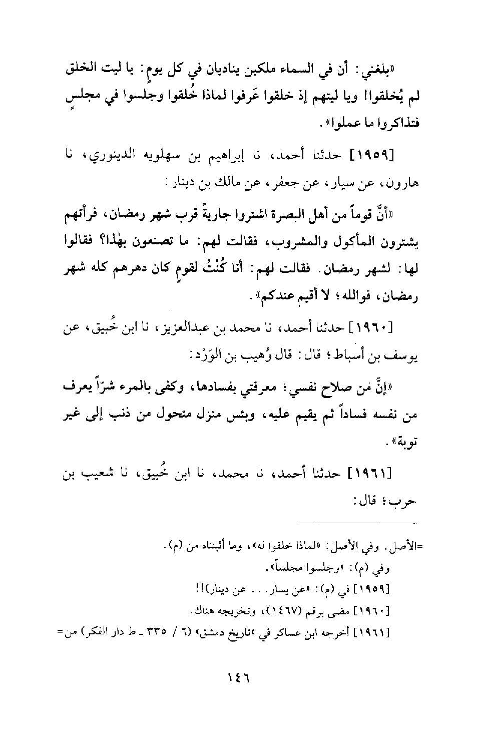 1959 - حَدَّثَنَا أَحْمَدُ، نَا إِبْرَاهِيمُ بْنُ سَهْلُوَيْهِ الدِّينَوَرِيُّ، نَا هَارُونُ، عَنْ سَيَّارٍ، عَنْ جَعْفَرٍ، عَنْ مَالِكِ بْنِ دِينَارٍ: أَنَّ قَوْمًا مِنْ أَهْلِ الْبَصْرَةِ اشْتَرَوْا جَارِيَةً قُرْبَ شَهْرِ رَمَضَانَ، فَرَأَتْهُمْ يَشْتَرُونَ الْمَأْكُولَ وَالْمَشْرُوبَ، فَقَالَتْ لَهُمْ: مَا تَصْنَعُونَ بِهَذَا؟ فَقَالُوا لَهَا: لِشَهْرِ رَمَضَانَ. فَقَالَتْ لَهُمْ: أَنَا كُنْتُ لِقَوْمٍ كَانَ دَهْرُهُمْ كُلُّهُ شَهْرَ رَمَضَانَ، فَوَاللهِ؛ لَا أُقِيمُ عِنْدَكُمْ.