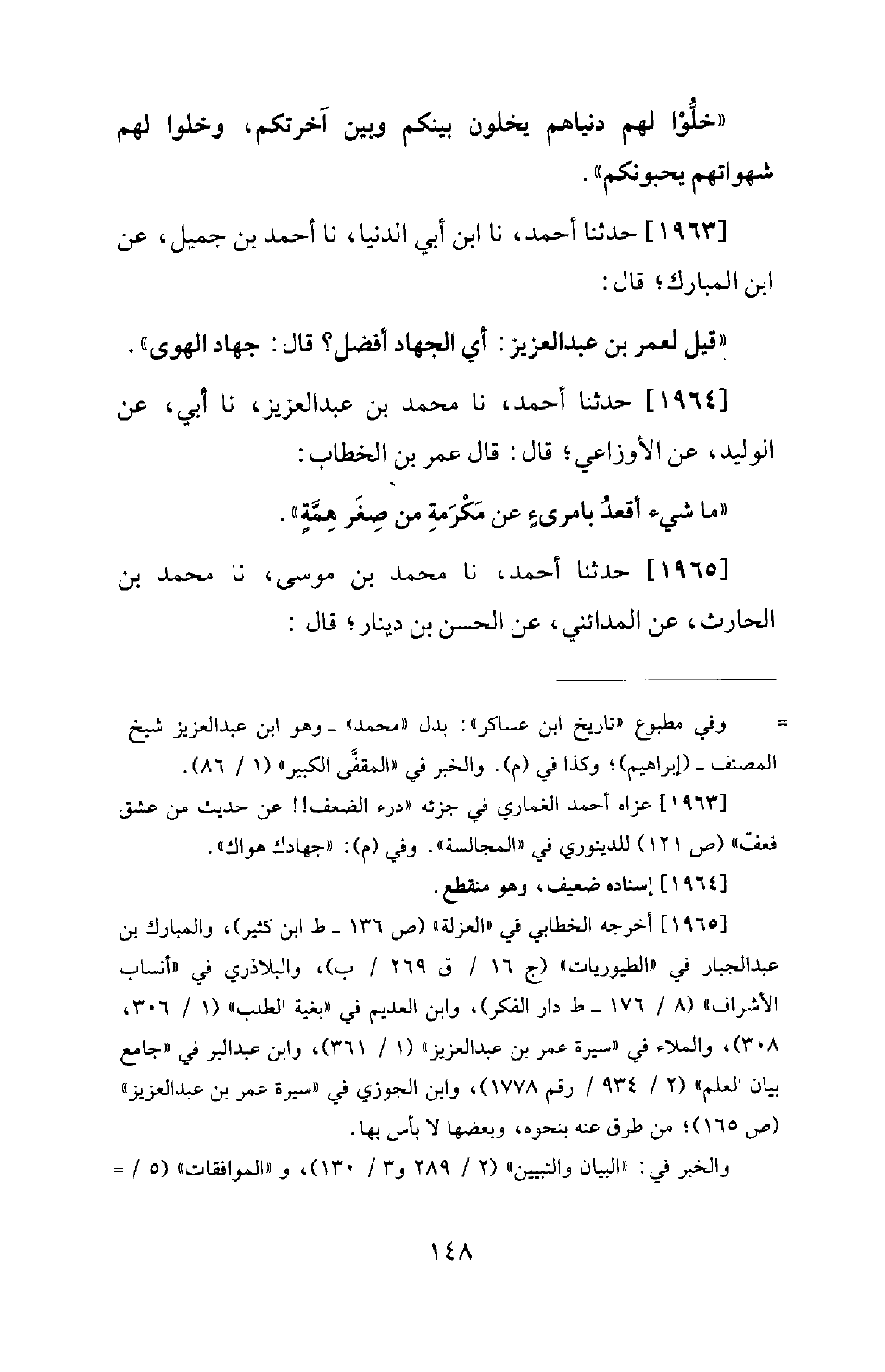 1963 - حَدَّثَنَا أحمد، نا ابن أَبِي الدُّنْيَا، نَا أَحْمَدُ بْنُ جَمِيلٍ، عَنِ ابْنِ الْمُبَارَكِ؛ قَالَ: قِيلَ لِعُمَرَ بْنِ عَبْدِ الْعَزِيزِ: أَيُّ الْجِهَادِ أَفْضَلُ؟ قَالَ: جِهَادُ الْهَوَى.