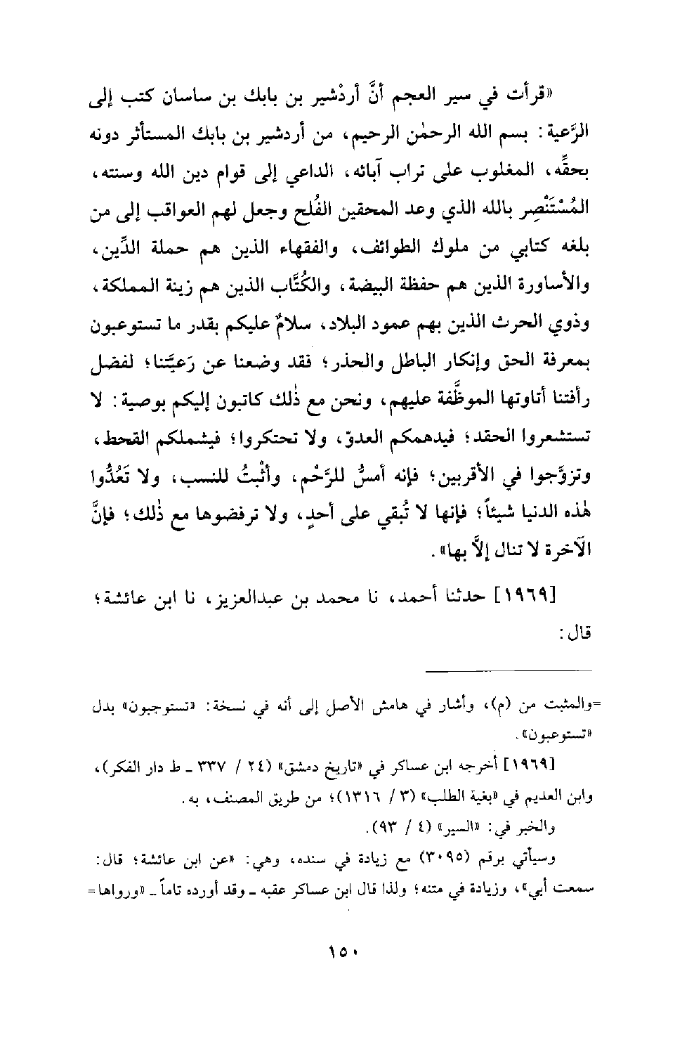 1969 - حَدَّثَنَا محمد، نَا مُحَمَّدُ بْنُ عَبْدِ الْعَزِيزِ، نَا ابْنُ عَائِشَةَ؛ قَالَ: -[151]- سُئِلَ الْأَحْنَفُ بْنُ قَيْسٍ: مَا الْمُرُوءَةُ؟ قَالَ: كِتْمَانُ السِّرِّ، وَالتَّبَاعُدُ مِنَ الشَّرِّ.