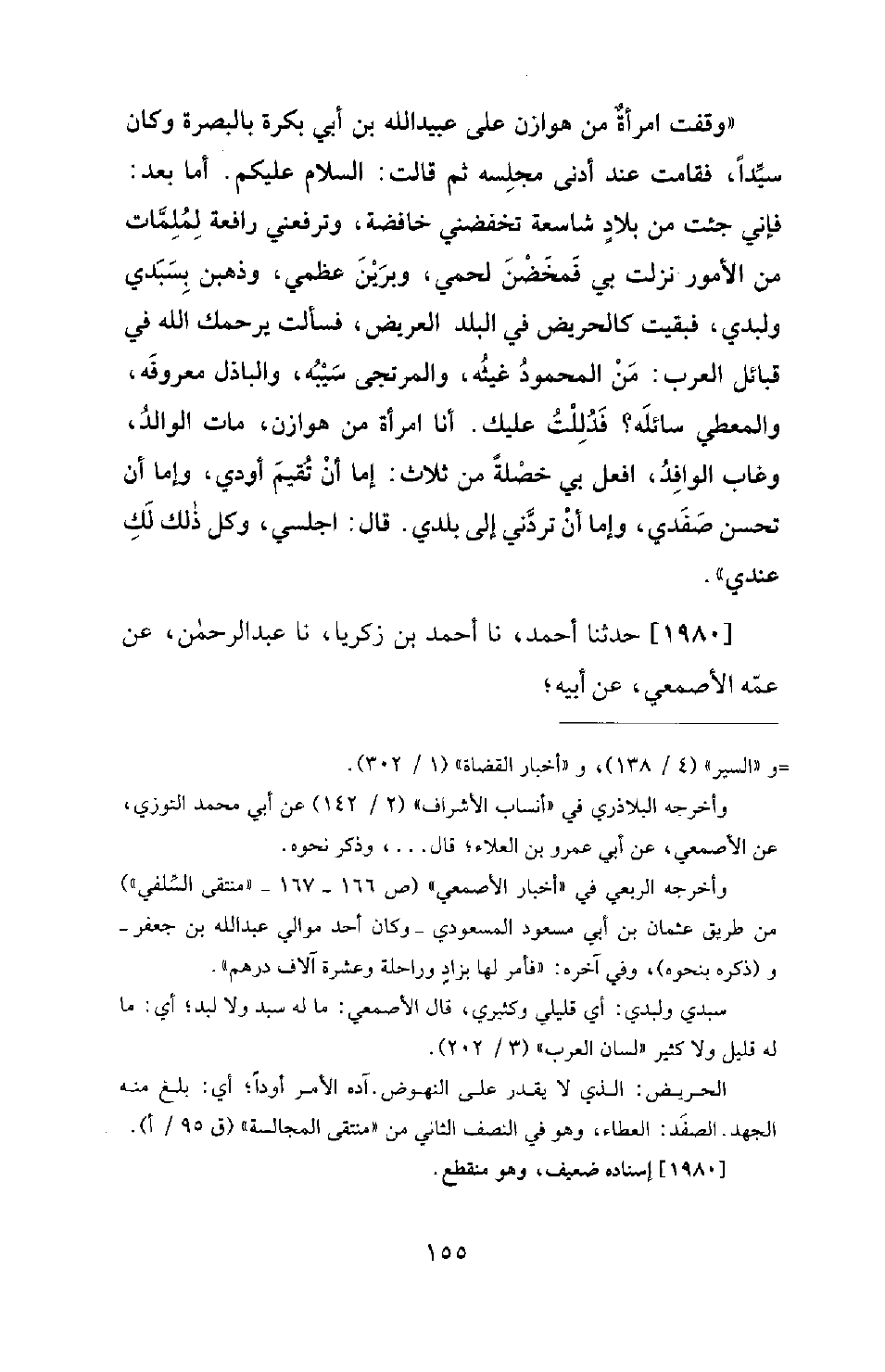 1980 - حَدَّثَنَا أَحْمَدُ، نَا أَحْمَدُ بْنُ زَكَرِيَّا، نَا عَبْدُ الرَّحْمَنِ، عَنْ عَمِّهِ الْأَصْمَعِيِّ، عَنْ أَبِيهِ: -[156]- أَنَّ عَلِيَّ بْنَ أَبِي طَالِبٍ رَأَى رَجُلًا قَاعِدًا فِي الشَّمْسِ، فَنَهَاهُ عَنِ الْقُعُودِ، وَقَالَ: قُمْ عَنْهَا؛ فَإِنَّهَا مَبْخَرَةٌ مُجْفَرَةٌ، تُتْفِلُ الرِّيحَ وَتُبْلِي الثَّوْبَ وَتُظْهِرَ الدَّاءَ الدَّفِينَ
