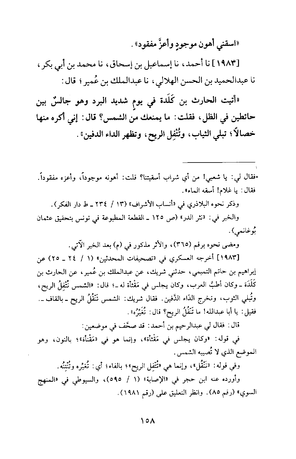 1983 - نَا أَحْمَدُ، نَا إِسْمَاعِيلُ بْنُ إِسْحَاقَ، نَا مُحَمَّدُ بْنُ أَبِي بَكْرٍ، نَا عَبْدُ الْحَمِيدِ بْنِ الْحَسَنِ الْهِلَالِيُّ نَا عَبْدُ الْمَلِكِ بْنُ عُمَيْرٍ؛ قَالَ: أَتَيْتُ الْحَارِثَ بْنَ كِلْدَةَ فِي يَوْمٍ شَدِيدِ الْبَرْدِ وَهُوَ جَالِسٌ بَيْنَ حَائِطَيْنِ فِي الظِّلِّ، فَقُلْتُ: مَا يَمْنَعُكَ مِنَ الشَّمْسِ؟ قَالَ: إِنِّي أَكْرَهُ مِنْهَا خِصَالًا؛ تُبْلِي الثِّيَابَ، وَتُتْفِلُ الرِّيحَ، وَتُظْهِرُ الدَّاءَ الدين.