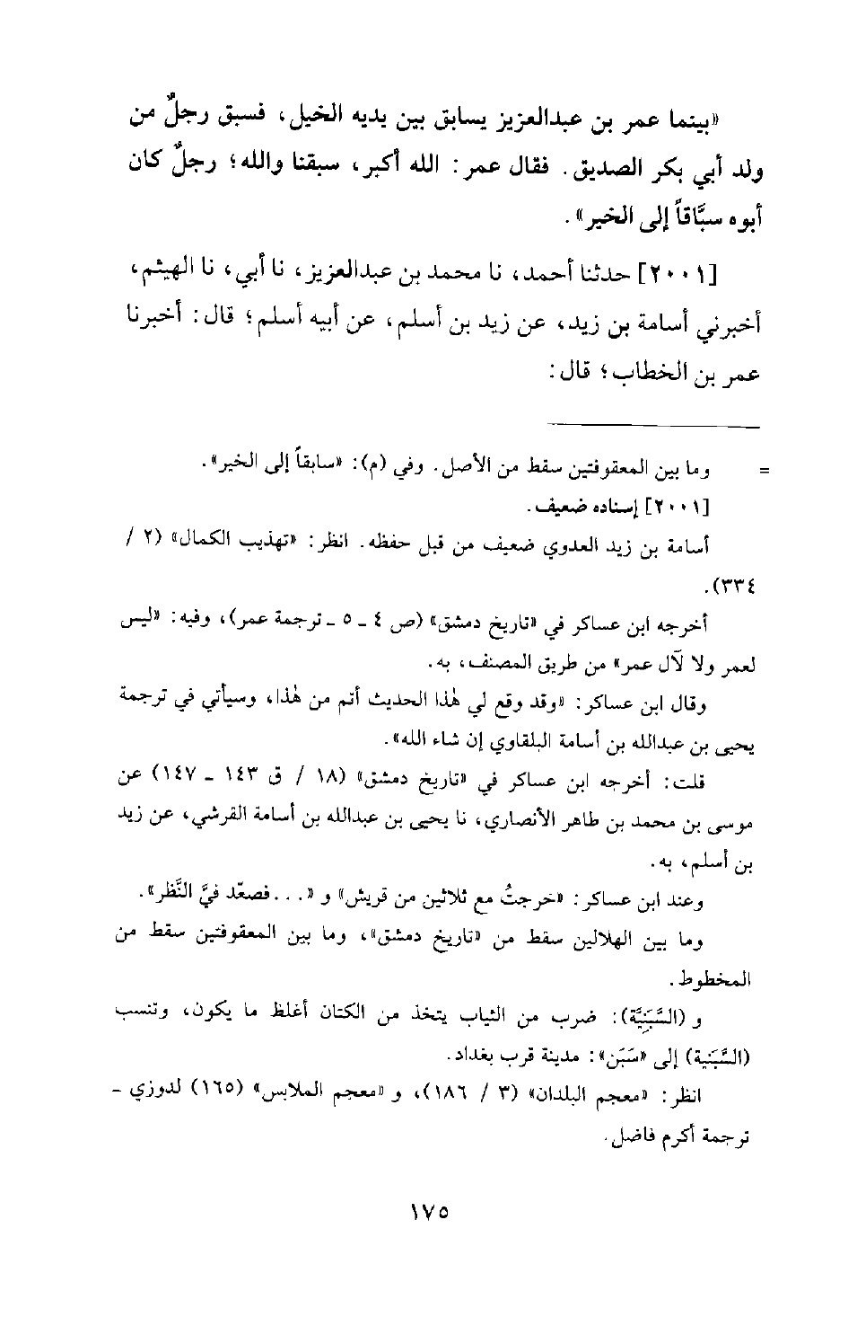 2001 - حَدَّثَنَا أَحْمَدُ، نَا مُحَمَّدُ بْنُ عَبْدِ الْعَزِيزِ، نَا أَبِي، نَا الْهَيْثَمُ، أَخْبَرَنِي أُسَامَةُ بْنُ زَيْدٍ، عَنْ زَيْدِ بْنِ أَسْلَمَ، عَنْ أَبِيهِ أَسْلَمَ؛ قَالَ: أَخْبَرَنَا عُمَرُ بْنُ الْخَطَّابِ؛ قَالَ: -[176]- خَرَجْتُ مَعَ نَاسٍ مِنْ قُرَيْشٍ فِي تِجَارَةٍ إِلَى الشَّامِ فِي الْجَاهِلِيَّةِ، فَلَمَّا خَرَجْنَا مِنْ مَكَّةَ نَسِيتُ قَضَاءَ حَاجَةٍ، فَرَجَعْتُ، فَقُلْتُ لِأَصْحَابِي: أَلْحَقُكُمْ، فَوَاللهِ! إِنِّي لَفِي سُوقٍ مِنْ أَسْوَاقِهَا إِذَا أَنَا بِبِطْرِيقٍ قَدْ جَاءَ، فَأَخَذَ بِعُنُقِي، فَذَهَبْتُ أُنَازِعُهُ، فَأَدْخَلَنِي كَنِيسَةً، فَإِذَا تُرَابٌ مُتَرَاكِمٌ بَعْضُهُ عَلَى بَعْضٍ، فَدَفَعَ إِلَيَّ مَجْرَفَةً وَفَأْسًا وَزِنْبِيلًا، وَقَالَ: انْقِلْ هَذَا التُّرَابَ، فَجَلَسْتُ أَتَفَكَّرُ فِي أَمْرِي كَيْفَ أَصْنَعُ؟ فَأَتَانِي فِي الْهَاجِرَةِ وَعَلَيْهِ سَبَنِيَّةُ قَصَبٍ أَرَى سَائِرَ جَسَدِهِ مِنْهَا، ثُمَّ قَالَ لِي: لَمْ أَرَكَ أَخْرَجْتَ شَيْئًا، ثُمَّ ضَمَّ أَصَابِعَهُ، فَضَرَبَ بِهَا وَسَطَ رَأْسِي، فَقُلْتُ: ثكلتك أمك [يا] عُمْرَ، وَبَلَغْتَ مَا أَرَى؟ ! فقمت بالمجرمة، فَضَرَبْتُ بِهَا هَامَّتَهُ فَإِذَا دِمَاغُهُ قَدِ انْتَثَرَ، فَأَخَذْتُهُ ثُمَّ وَارَيْتُهُ تَحْتَ التُّرَابِ، ثُمَّ خَرَجْتُ عَلَى وَجْهِي مَا أَدْرِي أَيْنَ أَسْلُكُ، فَمَشَيْتُ بَقِيَّةَ يَوْمِي وَلَيْلَتِي وَمِنَ الْغَدِ حَتَّى أَصْبَحْتُ، ثُمَّ انْتَهَيْتُ إِلَى دَيْرٍ فَاسْتَظْلَلْتُ فِي ظِلِّهِ، فَخَرَجَ إِلَيَّ رَجُلٌ مِنْ أَهْلِ الدَّيْرِ، فَقَالَ: يَا عَبْدَ الله! ما يجلسك ها هنا؟ قُلْتُ: أُضْلِلْتُ عَنْ أَصْحَابِي. قَالَ: مَا أَنْتَ عَلَى الطَّرِيقِ، وَإِنَّكَ لَتَنْظُرُ بِعَيْنِ خَائِفٍ، ادْخُلْ فَأَصِبِ الطَّعَامَ وَاسْتَرِحْ وَنَمْ، فَدَخَلْتُ، فَجَاءَنِي بِطَعَامٍ وَشَرَابٍ وَلَطَفٍ -[177]- وَصَعَّدَ فِي الْبَصَرِ وخفضة ثُمَّ قَالَ: يَا هَذَا! قَدْ عَلِمَ أَهْلُ الْكِتَابِ أَنَّهُ لَمْ يَبْقَ عَلَى وَجْهِ الْأَرْضِ أَحَدٌ أَعْلَمُ مِنِّي بِالْكِتَابِ، وإني أَجِدُ صِفَتَكَ الَّذِي يُخْرِجُنَا مَنْ هَذَا الدِّيرِ وَيَغْلِبُ عَلَى هَذِهِ الْبَلْدَةِ. فَقُلْتُ لَهُ: أَيُّهَا الرَّجُلُ! قَدْ ذَهَبْتُ فِي غَيْرِ مَذْهَبٍ. قَالَ: مَا اسْمُكَ؟ قُلْتُ: عُمَرُ بْنُ الْخَطَّابِ. قَالَ: أَنْتَ وَاللهِ! صَاحِبُنَا غَيْرُ شَكٍّ، فَاكْتُبْ لِي عَلَى دَيْرِي وَمَا فِيهِ. قُلْتُ: أَيُّهَا الرَّجُلُ! قَدْ صَنَعْتَ مَعْرُوفًا فَلَا تُكَدِّرْهُ. فَقَالَ: اكْتُبْ لِي كِتَابًا فِي رَقٍّ، لَيْسَ عليك فيه شيء؛ فَإِنْ تَكُ صَاحِبُنَا؛ فَهُوَ مَا نُرِيدُ، وَإِنْ تَكُنِ الْأُخْرَى؛ فَلَيْسَ يَضُرُّكَ. قُلْتُ: هَاتِ، فَكَتَبْتُ لَهُ، ثُمَّ خَتَمْتُ عَلَيْهِ، فَدَعَا بِنَفَقَةٍ فَدَفَعَهَا إِلَيَّ وَبِأَثْوَابٍ وَبِأَتَانٍ قَدْ أُوكِفَتْ، فَقَالَ: أَلَا تَسْمَعُ. قُلْتُ: نَعَمْ. قَالَ: اخرج عليها؛ فإنك لَا تَمُرُّ بِأَهْلِ دَيْرٍ إِلَّا عَلَفُوهَا وَسَقَوْهَا حَتَّى إِذَا بَلَغْتَ مَأْمَنَكَ؛ فَاضْرِبْ وَجْهَهَا مُدْبِرَةً؛ فَإِنَّهَا لَا تَمُرُّ بِقَوْمٍ وَلَا أَهْلِ دَيْرٍ إِلَّا عَلَفُوهَا وَسَقَوْهَا حَتَّى تَصِيرَ إِلَيَّ، فَرَكِبْتُ، فلم أمر بِقَوْمٍ إِلَّا عَلَفُوهَا وَسَقَوْهَا، حَتَّى إِذَا أَدْرَكْتُ أَصْحَابِي مُتَوَجِّهِينَ إِلَى الْحِجَازِ فَضَرَبْتُ وَجْهَهَا مُدْبِرَةً ثُمَّ صِرْتُ مَعَهُمْ، فَلَمَّا قَدِمَ عُمَرُ الشَّامَ فِي خِلَافَتِهِ أَتَاهُ ذَلِكَ الرَّاهِبُ - وَهُوَ صَاحِبُ دِيرِ الْعَدَسِ - بِذَلِكَ الْكِتَابِ، فَلَمَّا رَآهُ عُمَرُ تَعَجَّبَ مِنْهُ، فَقَالَ: أَوْفِ لِي بِشَرْطِي. فَقَالَ عُمَرُ: لَيْسَ لِعُمَرَ وَلَا لَابْنِ عُمَرَ مِنْهُ شَ