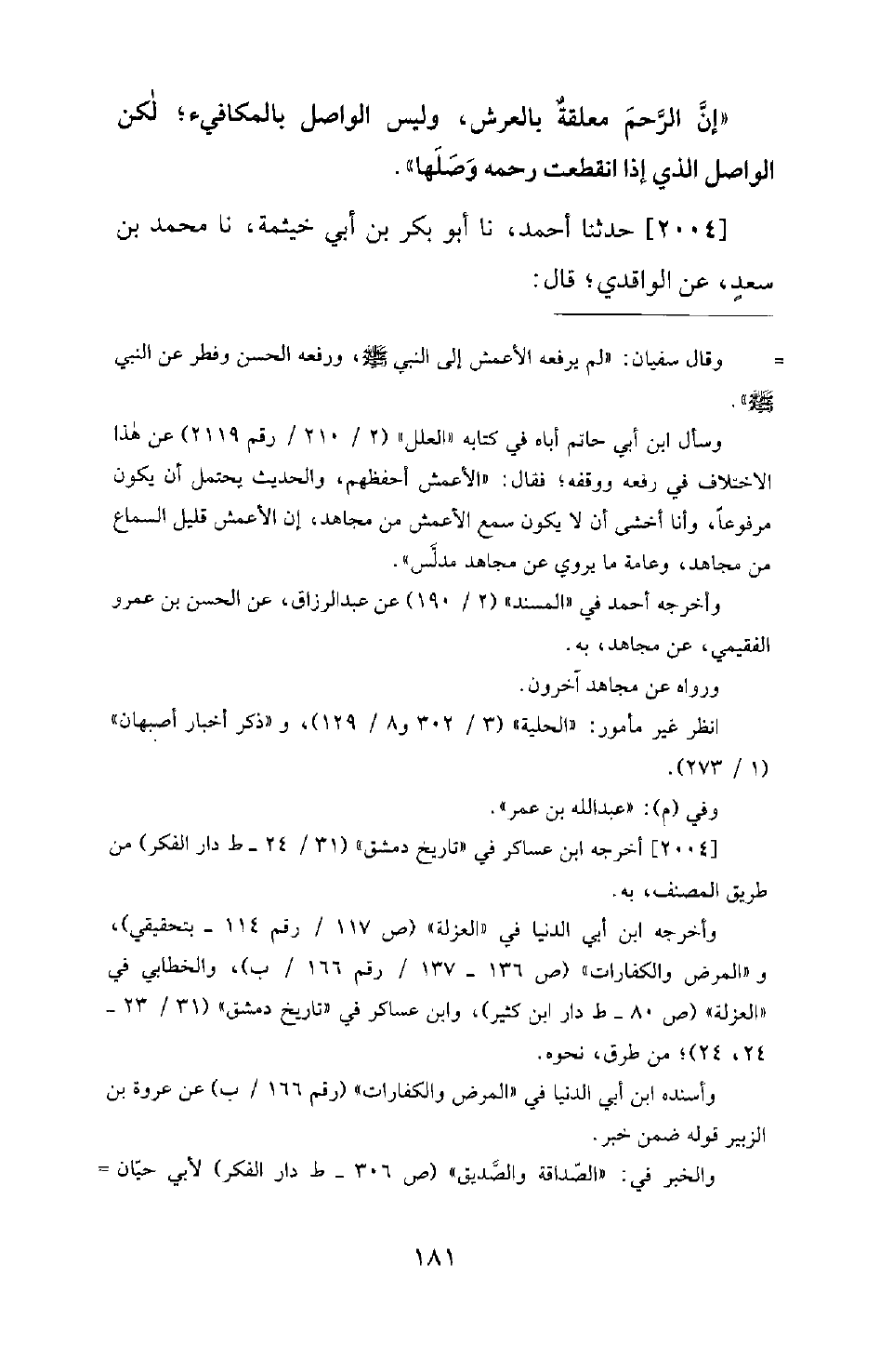 2004 - حَدَّثَنَا أَحْمَدُ، نَا أَبُو بَكْرِ بْنُ أَبِي خَيْثَمَةَ، نَا مُحَمَّدُ بْنُ سَعِد، عَنِ الْوَاقِدِيِّ؛ قَالَ: -[182]- قِيلَ لِعَبْدِ اللهِ بْنِ عُرْوَةَ بْنِ الزُّبَيْرِ بْنِ الْعَوَّامِ: تَرَكْتَ الْمَدِينَةَ دَارَ الْهِجْرَةَ، فَلَوْ رَجَعْتَ لَقِيتَ النَّاسَ وَلَقِيَكَ النَّاسُ. فَقَالَ: وَأَيْنَ النَّاسُ؟ إِنَّمَا النَّاسُ رَجُلَانِ؛ شَامِتٌ لِنَكْبَةٍ، أَوْ حَاسِدٌ لِنِعْمَةٍ.
