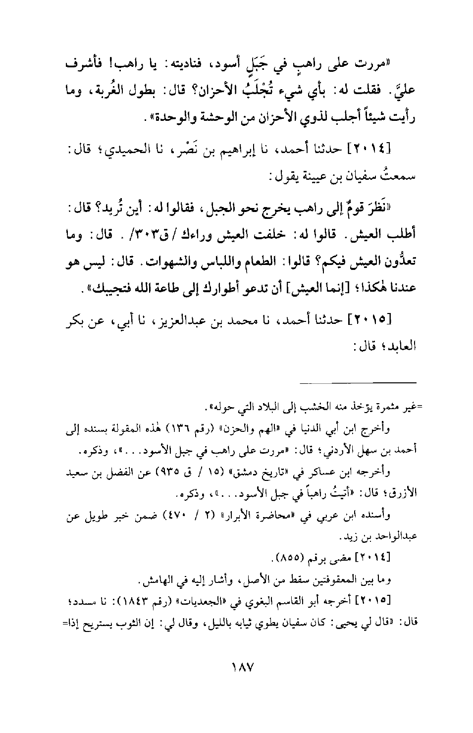 2014 - حَدَّثَنَا أَحْمَدُ، نَا إِبْرَاهِيمُ بْنُ نَصْرٍ، نَا الْحُمَيْدِيُّ؛ قَالَ: سَمِعْتُ سُفْيَانَ بْنَ عُيَيْنَةَ يَقُولُ: نَظَرَ قَوْمٌ إِلَى رَاهِبٍ يَخْرُجُ نَحْوَ الْجَبَلِ، فَقَالُوا لَهُ: أَيْنَ تُرِيدُ؟ قَالَ: أَطْلُبُ الْعَيْشَ. قَالُوا لَهُ: خَلَّفْتَ الْعَيْشَ وَرَاءَكَ. قَالَ: وَمَا تَعُدُّونَ الْعَيْشَ فِيكُمْ؟ قَالُوا: الطَّعَامَ وَاللِّبَاسَ وَالشَّهَوَاتِ. قَالَ: لَيْسَ هُوَ عِنْدَنَا هَكَذَا؛ إِنَّمَا الْعَيْشُ أَنْ تَدْعُو أَطْوَارَكَ إِلَى طَاعَةِ اللهِ فَتُجِيبَكَ.
