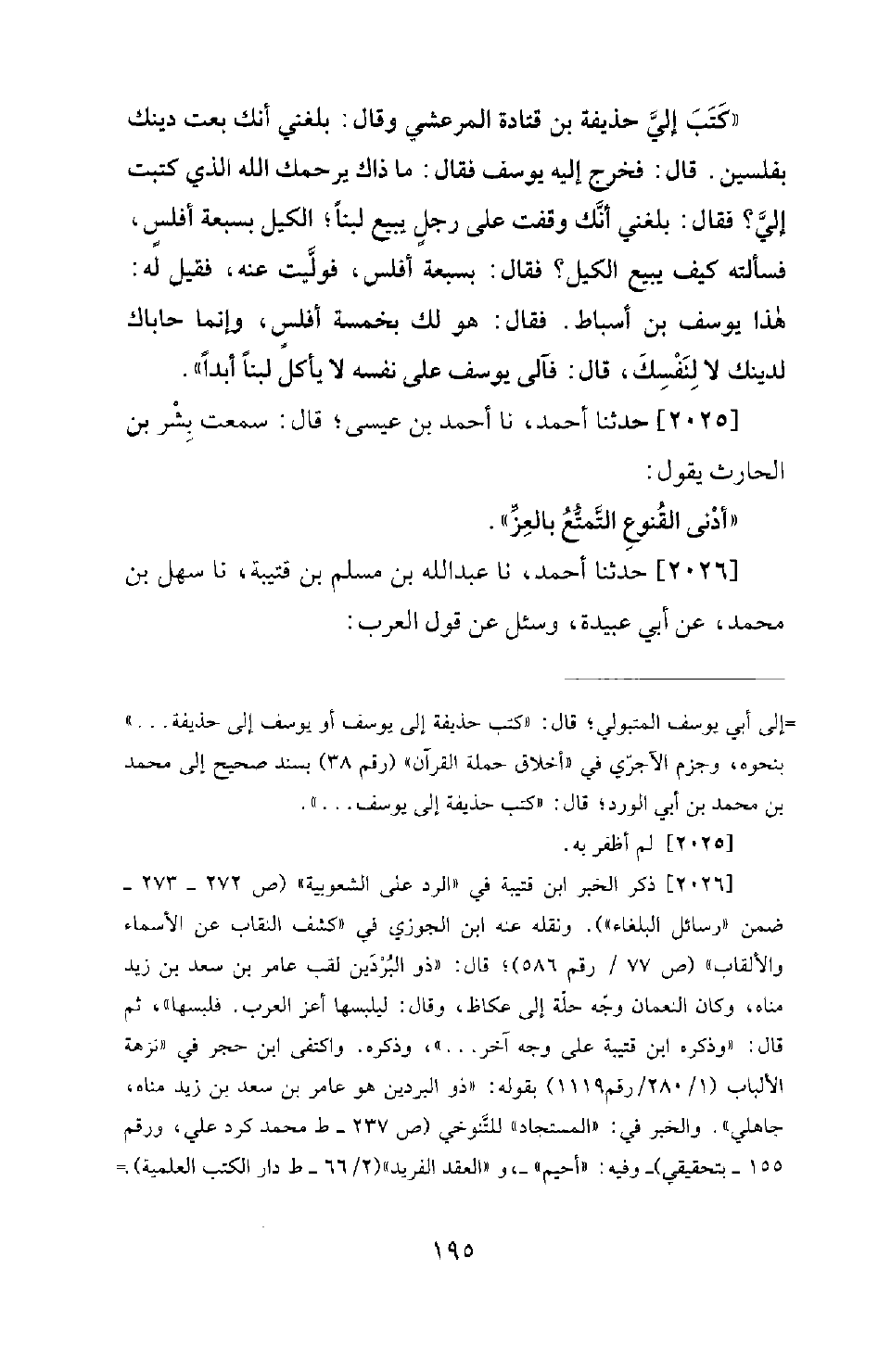 2025 - حَدَّثَنَا أَحْمَدُ، نَا أَحْمَدُ بْنُ عِيسَى؛ قَالَ: سَمِعْتُ بِشْرُ بْنُ الْحَارِثَ يَقُولُ: أَدْنَى الْقُنُوعِ التَّمَتُّعُ بِالْعِزِّ.