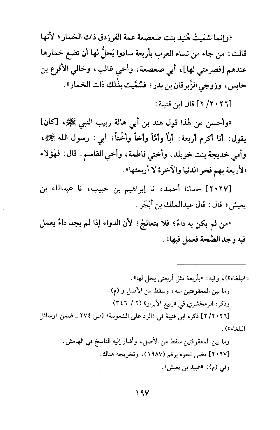 2026 - / 2 - قَالَ ابْنُ قُتَيْبَةَ: وَأَحْسَنُ مِنْ هَذَا قَوْلُ هِنْدِ بْنِ أَبِي هَالَةَ رَبِيبِ النَّبِيِّ صَلَّى اللَّهُ عَلَيْهِ وَسَلَّمَ، كَانَ يَقُولُ: أَنَا أَكْرَمُ أَرْبَعَةٍ: أَبًا وَأُمًّا وَأَخًا وَأُخْتًا؛ أَبِي: رَسُولِ اللهِ صَلَّى اللَّهُ عَلَيْهِ وَسَلَّمَ، وَأُمِّي خَدِيجَةُ بِنْتُ خُوَيْلِدٍ، وَأُخْتِي فَاطِمَةُ، وَأَخِي الْقَاسِمُ. قَالَ: فَهَؤُلَاءِ الْأَرْبَعَةُ بِهِمْ فَخْرُ الدُّنْيَا وَالْآخِرَةِ لَا أَرْبَعْتُهَا.