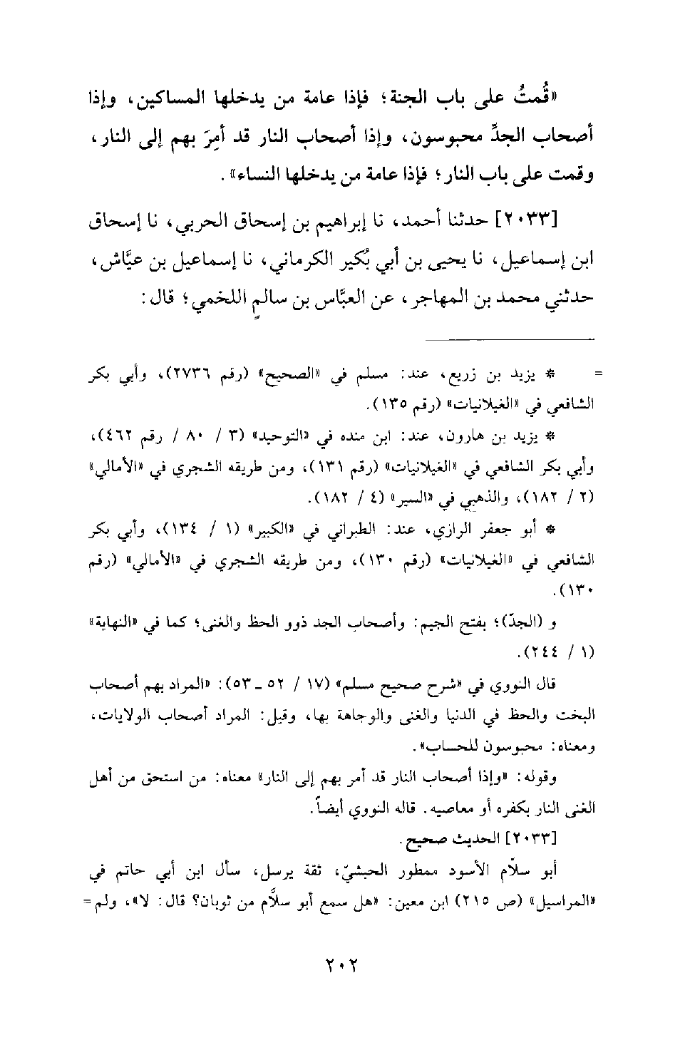 2033 - حَدَّثَنَا أَحْمَدُ، نَا إِبْرَاهِيمُ بْنُ إِسْحَاقَ الْحَرْبِيُّ، نَا إِسْحَاقُ بْنُ إِسْمَاعِيلَ، نَا يَحْيَى بْنُ أَبِي بُكَيْرٍ الْكَرْمَانِيُّ، نَا إِسْمَاعِيلُ بْنُ عَيَّاشٍ، حَدَّثَنِي مُحَمَّدُ بْنُ الْمُهَاجِرِ، عَنِ الْعَبَّاسِ بْنِ سَالِمٍ اللَّخْمِيِّ؛ قَالَ: -[207]- بَعَثَ عُمَرُ بْنُ عَبْدِ الْعَزِيزِ إِلَى أَبِي سَلامٍ، فَحَمَلَ عَلَى الْبَرِيدِ، فَلَمَّا قَدِمَ عَلَيْهِ أَبُو سَلامٍ؛ قَالَ: لَقَدْ شَقَّ عَلَيَّ مَحْمَلِي عَلَى الْبَرِيدِ. فَقَالَ: مَا أَرَدْنَا الْمَشَقَّةَ عَلَيْكَ، وَلَكِنْ بَلَغَنِي عَنْكَ حَدِيثَ ثَوْبَانَ مَوْلَى رَسُولِ اللهِ صَلَّى اللَّهُ عَلَيْهِ وَسَلَّمَ فِي الْحَوْضِ؛ فَأَحْبَبْتُ أَنْ أُشَافِهَكَ بِهِ. فَقَالَ: سَمِعْتُ ثَوْبَانَ مَوْلَى رَسُولِ اللهِ صَلَّى اللَّهُ عَلَيْهِ وَسَلَّمَ يَقُولُ: سَمِعْتُ رَسُولِ اللهِ صَلَّى اللَّهُ عَلَيْهِ وَسَلَّمَ يَقُولُ: «إِنَّ حَوْضِي مَا بَيْنَ عَدَنٍ إِلَى عَمَّانَ الْبَلْقَاءِ، مَاؤُهُ أَشَدُّ بَيَاضًا مِنَ -[208]- اللَّبَنِ، وَأَحْلَى مِنَ الْعَسَلِ، وَآنِيَتُهُ عَدَدَ نُجُومِ السَّمَاءِ، مَنْ شَرِبَ مِنْهُ شَرْبَةً لَمْ يَظْمَأْ بَعْدَهَا أَبَدًا، وَأَوَّلُ النَّاسِ وُرُودًا عَلَيْهِ فُقَرَاءِ الْمُهَاجِرِينَ» . قَالَ عُمَرُ بْنُ الْخَطَّابِ: صِفْهُمْ لِي يَا رَسُولَ اللهِ! فَقَالَ: «هُمُ الشُّعْثُ رؤوسا، الدُّنُسُ ثِيَابًا، الَّذِينَ لَا يَنْكِحُونَ الْمُتَنَعِّمَاتِ فِي الْمَكَاتِيرِ، وَلَا تُفْتَحْ لَهَمْ أَبْوَابَ السُّدَدِ» . فَقَالَ عُمَرُ بْنُ عَبْدِ الْعَزِيزِ: وَاللهِ! لَقَدْ نَكَحْتُ الْمُتَنَعِّمَاتِ: فَاطِمَةَ بِنْتَ عَبْدِ الْمَلِكِ بْنِ مَرْوَانَ، وَفُتِحَتْ لِي أَبْوَابَ السُّدَدِ؛ إِلَّا أَنْ يَرْحَمَ اللهُ، لَا جَرْمَ أَنْ لَا أَدْهُنَ رَأْسِي حَتَّى تَشْعَثَ، وَلَا أَغْسِلَ ثَوْبِي الَّذِي يَلِي جَسَدِي حَتَّى يَتَّسِخَ