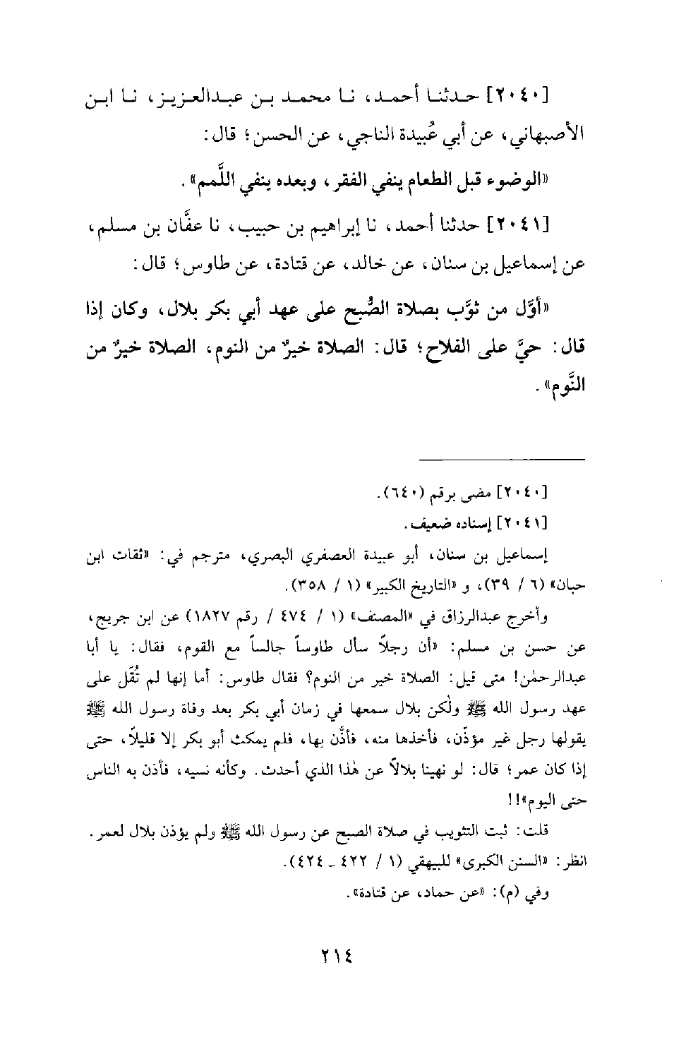 2041 - حَدَّثَنَا أَحْمَدُ، نَا إِبْرَاهِيمُ بْنُ حَبِيبٍ، نَا عَفَّانُ بْنُ مُسْلِمٍ، عَنْ إِسْمَاعِيلَ بْنِ سِنَانَ، عَنْ خَالِدٍ، عَنْ قَتَادَةَ، عَنْ طَاوُسٍ؛ قَالَ: أَوَّلُ مَنْ ثَوَّبَ بِصَلَاةِ الصُّبْحِ عَلَى عَهْدِ أَبِي بَكْرٍ بِلَالٌ، وَكَانَ إِذَا قَالَ: حَيَّ عَلَى الْفَلَاحِ؛ قَالَ: الصَّلَاةُ خَيْرٌ مِنَ النَّوْمِ، الصَّلَاةُ خَيْرٌ مِنَ النَّوْمِ