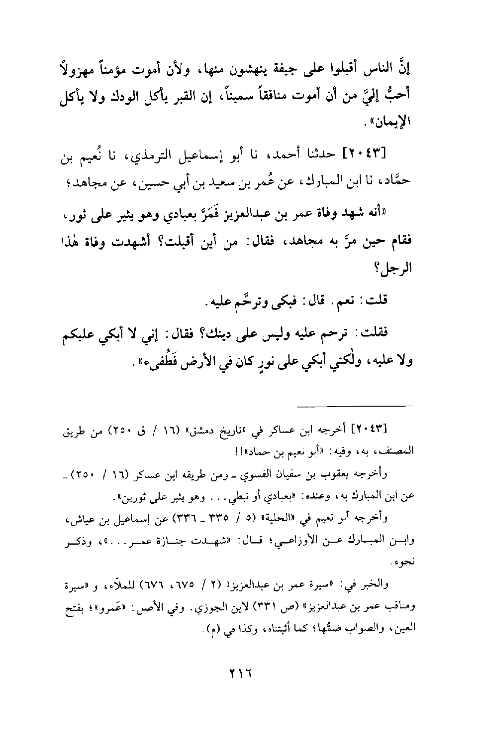 2043 - حَدَّثَنَا أَحْمَدُ، نَا أبو إِسْمَاعِيلَ التِّرْمِذيُّ، نَا نُعَيْمُ بْنُ حَمَّادٍ، نَا ابْنُ الْمُبَارَكِ، عَنْ عُمَرَ بْنِ سَعِيدِ بْنِ أَبِي حُسَيْنٍ، عَنْ مُجَاهِدٍ: أَنَّهُ شَهِدَ وَفَاةَ عُمَرَ بْنِ عَبْدِ الْعَزِيزِ فَمَرَّ بِعَبَّادِيٍّ وَهُوَ يُثِيرُ عَلَى ثَوْرٍ، فَقَامَ حِينَ مَرَّ بِهِ مُجَاهِدٌ، فَقَالَ: مِنْ أَيْنَ أَقْبَلْتَ؟ أَشَهِدْتَ وَفَاةَ هَذَا الرَّجُلِ. قُلْتُ: نَعَمْ. قَالَ: فَبَكَى وَتَرَحَّمَ عَلَيْهِ. فَقُلْتُ: تَرَحَّمْ عَلَيْهِ وَلَيْسَ عَلَى دِينِكَ؟ فَقَالَ: إِنِّي لَا أَبْكِي عَلَيْكُمْ وَلَا عَلَيْهِ، وَلَكِنِّي أَبْكِي عَلَى نُورٍ كَانَ فِي الْأَرْضِ فَطُفِئَ.