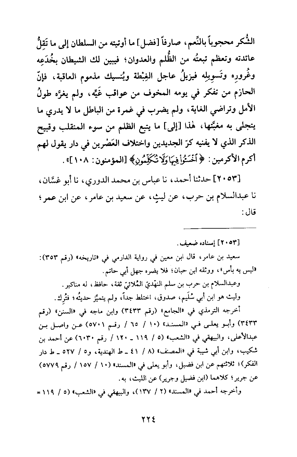2053 - حَدَّثَنَا أَحْمَدُ، نَا عَبَّاسُ بْنُ مُحَمَّدٍ الدُّورِيُّ، نَا أَبُو غَسَّانَ، نَا عَبْدُ السَّلَامِ بْنُ حَرْبٍ، عَنْ لَيْثٍ عَنْ سَعِيدِ بْنِ عَامِرٍ، عَنِ ابْنِ عُمَرَ؛ قَالَ: -[225]- كُنَّا مَعَ رَسُولِ اللهِ صَلَّى اللَّهُ عَلَيْهِ وَسَلَّمَ فِي سَفَرٍ، فَمَرَرْنَا بِبِرْكَةٍ مِنْ مَاءٍ، فَكَرَعْنَا فِيهَا، فَقَالَ رَسُولُ اللهِ صَلَّى اللَّهُ عَلَيْهِ وَسَلَّمَ «لَا تَكْرَعُوا، وَاغْسِلُوا أَيْدِيَكُمْ وَاشْرَبُوا فِيهَا؛ فَإِنَّهُ لَا إِنَاءَ أَنْظَفُ مِنْهَا»