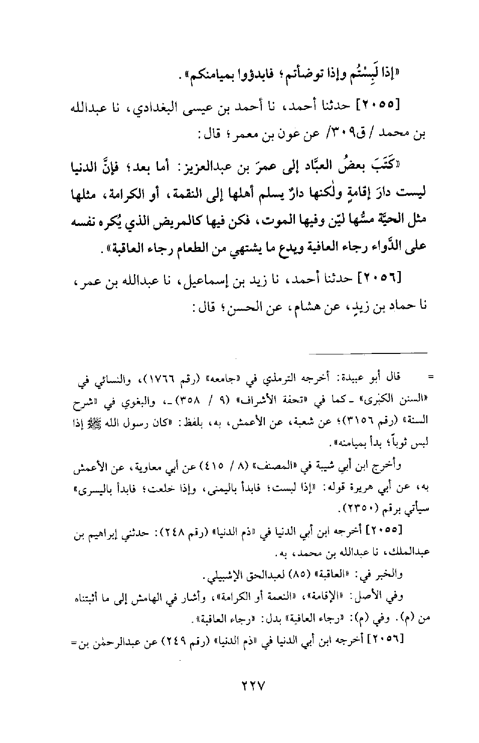 2055 - حَدَّثَنَا أَحْمَدُ، نَا أَحْمَدُ بْنُ عِيسَى الْبَغْدَادِيُّ، نَا عَبْدُ اللهِ بْنُ مُحَمَّدٍ، عَنْ عَوْنِ بْنِ مَعْمَرٍ؛ قَالَ: كَتَبَ بَعْضُ الْعُبَّادِ إِلَى عُمَرَ بْنِ عَبْدِ الْعَزِيزِ: أَمَّا بَعْدُ؛ فَإِنَّ الدُّنْيَا لَيْسَتْ دَارَ إِقَامَةٍ، وَلَكِنَّهَا دَارٌ يَسْلَمُ أَهْلُهَا إِلَى النِّقْمَةِ، أَوِ الْكَرَامَةِ، مَثَلُهَا مَثْلُ الْحَيَّةِ مَسُّهَا لَيِّنٌ وَفِيهَا الْمَوْتُ، فَكُنْ فِيهَا كَالْمَرِيضِ الَّذِي يُكْرِهُ نَفْسَهُ عَلَى الدَّوَاءِ رَجَاءَ الْعَافِيَةِ، وَيَدَعُ مَا يَشْتَهِي مِنَ الطَّعَامِ رَجَاءَ الْعَاقِبَةِ.