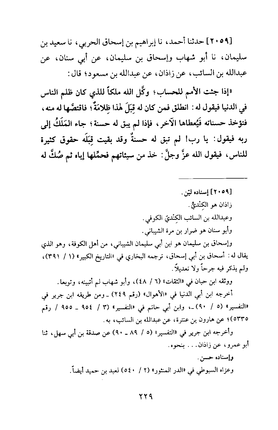 2059 - حَدَّثَنَا أَحْمَدُ، نَا إِبْرَاهِيمُ بْنُ إِسْحَاقَ الْحَرْبِيُّ، نَا سَعِيدُ بْنُ سُلَيْمَانَ، نَا أَبُو شِهَابٍ وَإِسْحَاقُ بْنُ سُلَيْمَانَ، عَنْ أَبِي سِنَانَ، عَنْ عَبْدِ اللهِ بْنِ السَّائِبِ، عَنْ زَاذَانَ، عَنْ عَبْدِ اللهِ بْنِ مَسْعُودٍ؛ قَالَ: إِذَا جَثَتِ الْأُمَمُ لِلْحِسَابِ؛ وَكَّلَ اللهُ مَلَكًا لِلَّذِي كَانَ ظَلَمَ النَّاسَ فِي الدُّنْيَا، فَيَقُولُ لَهُ: انْطَلِقْ فَمَنْ كَانَ لَهُ قِبَلَ هَذَا ظِلَامَةٌ؛ فَاقْتَصَّهَا لَهُ مِنْهُ، فَتُؤْخَذُ حَسَنَاتُهُ فَيُعْطَاهَا الْآخَرُ، فَإِذَا لَمْ يَبْقَ لَهُ حَسَنَةٌ؛ جَاءَ الْمَلَكُ إِلَى رَبِّهِ فَيَقُولُ: يَا رَبِّ! لَمْ تَبْقَ لَهُ حَسَنَةٌ، وَقَدْ بَقِيَتْ قِبَلِهِ حُقُوقٌ كَثِيرَةٌ لِلنَّاسِ، فَيَقُولُ اللهُ عَزَّ وَجَلَّ: خُذْ مِنْ سَيِّئَاتِهِمْ فَحَمِّلْهَا إِيَّاهُ ثُمَّ صُكَّ لَهُ -[230]- صَكًّا إِلَى النَّارِ. قَالَ أَبُو سِنَانَ: قَالَ عَبْدُ اللهِ بْنُ السَّائِبَ: فَإِذَا أَرَادَ اللهُ بِعَبْدٍ خَيْرًا؛ أَبْقَى لَهُ حَسَنَةٌ فَيُضَاعِفُهَا ثُمَّ يُدْخِلُهُ بِهَا الْجَنَّةَ، ثُمَّ تَلَا: {إِنَّ اللهَ لا يَظْلِمُ مِثْقَالَ ذَرَّةٍ} إِلَى آخِرِ الْآيَةِ [النساء: 40]
