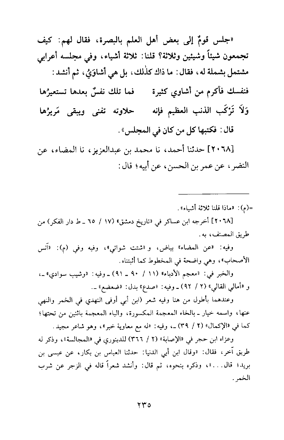 2068 - حَدَّثَنَا أَحْمَدُ، نَا مُحَمَّدُ بْنُ عَبْدِ الْعَزِيزِ، نَا الْمَضَاءُ، عَنِ النَّضْرِ، عَنْ عُمَرَ بْنِ الْحَسَنِ، عَنْ أَبِيهِ؛ قَالَ: -[236]- دَخَلَ ابْنُ أَبِي أَوْفَى النَّهْدِيُّ عَلَى مُعَاوِيَةَ بْنِ أَبِي سُفْيَانَ وَكَانَ كَبِيرَ السِّنِّ، فَقَالَ لَهُ مُعَاوِيَةُ: لَقَدْ غَيَّرَكَ الدَّهْرُ، فَقَالَ: نَعَمْ يَا أَمِيرَ الْمُؤْمِنِينَ! ضَعْضَعَ قَنَاتِي، وَشَيَّبَ شَوَاتِي، وَأَفْنَى لَذَّاتِي، وَجَرَّأَ عَلَيَّ عِدَاتِي، وَلَقَدْ بَقِيتُ زَمَانًا أَسُرُّ الْأَصْحَابَ وَأُسْبِلُ الثِّيَابَ وَآلَفُ الْأَحْبَابَ، فَبَادُوا عَنِّي وَدَنَا الْمَوْتُ مِنِّي. وقَالَ: الشَّوَى: جِلْدَةُ الرَّأْسِ. وَالشَّوَى: الْيَدَانِ وَالرِّجْلَانِ.