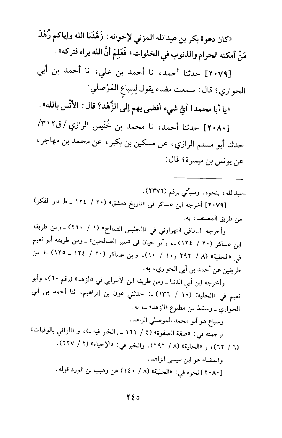 2079 - حَدَّثَنَا أَحْمَدُ، نَا أَحْمَدُ بْنُ عَلِيٍّ، نَا أَحْمَدُ بْنُ أَبِي الْحَوَارِيِّ؛ قَالَ: سَمِعْتُ مَضَاءً يَقُولُ لِسِبَاعٍ الْمَوْصِلِيِّ: يَا أَبَا مُحَمَّدٍ! أَيُّ شَيْءٍ أَفْضَى بِهِمْ إِلَى الزُّهْدِ؟ قَالَ: الأُنْسُ بِاللهِ.